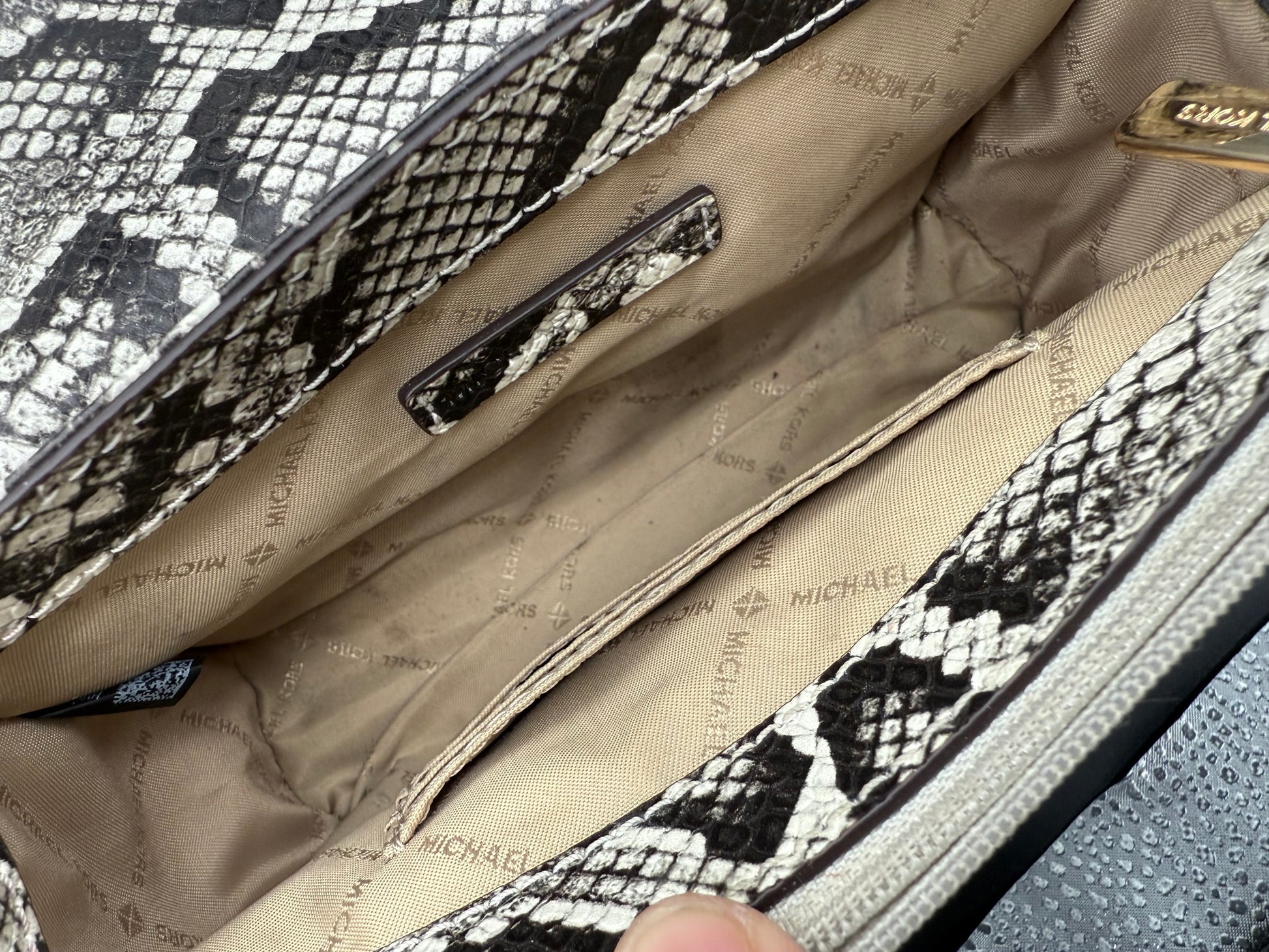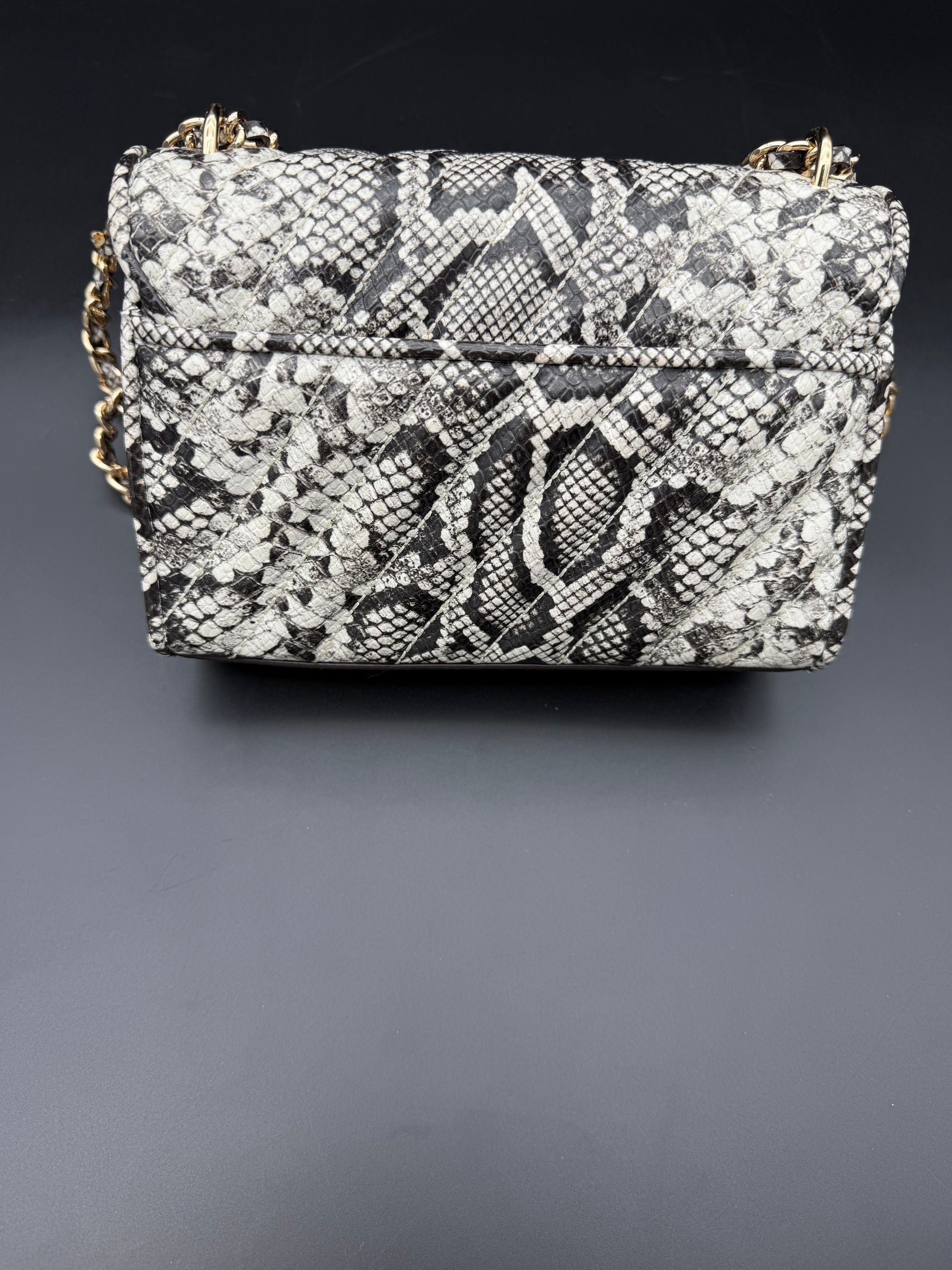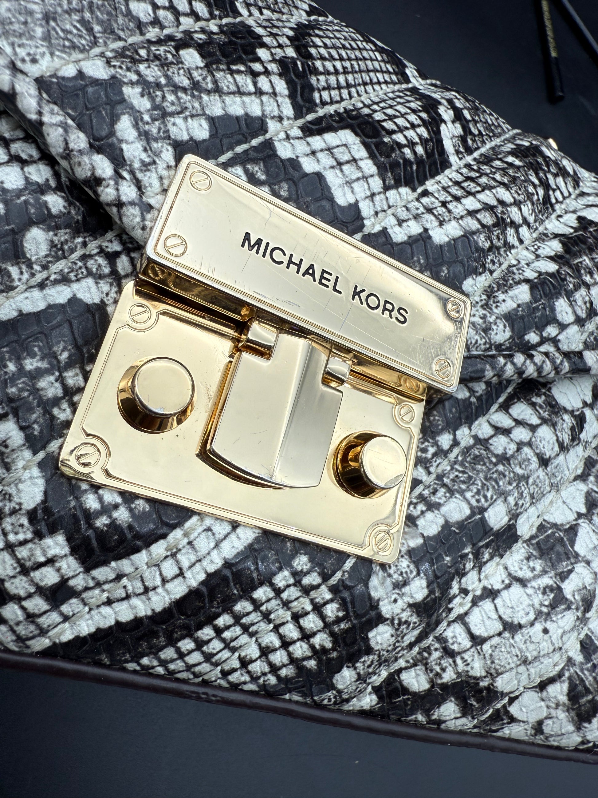 This is a Michael Kors handbag featuring a snakeskin pattern with a gold-toned chain strap and clasp. The clasp is adorned with the brand's logo, adding a sophisticated touch to the chic design.
