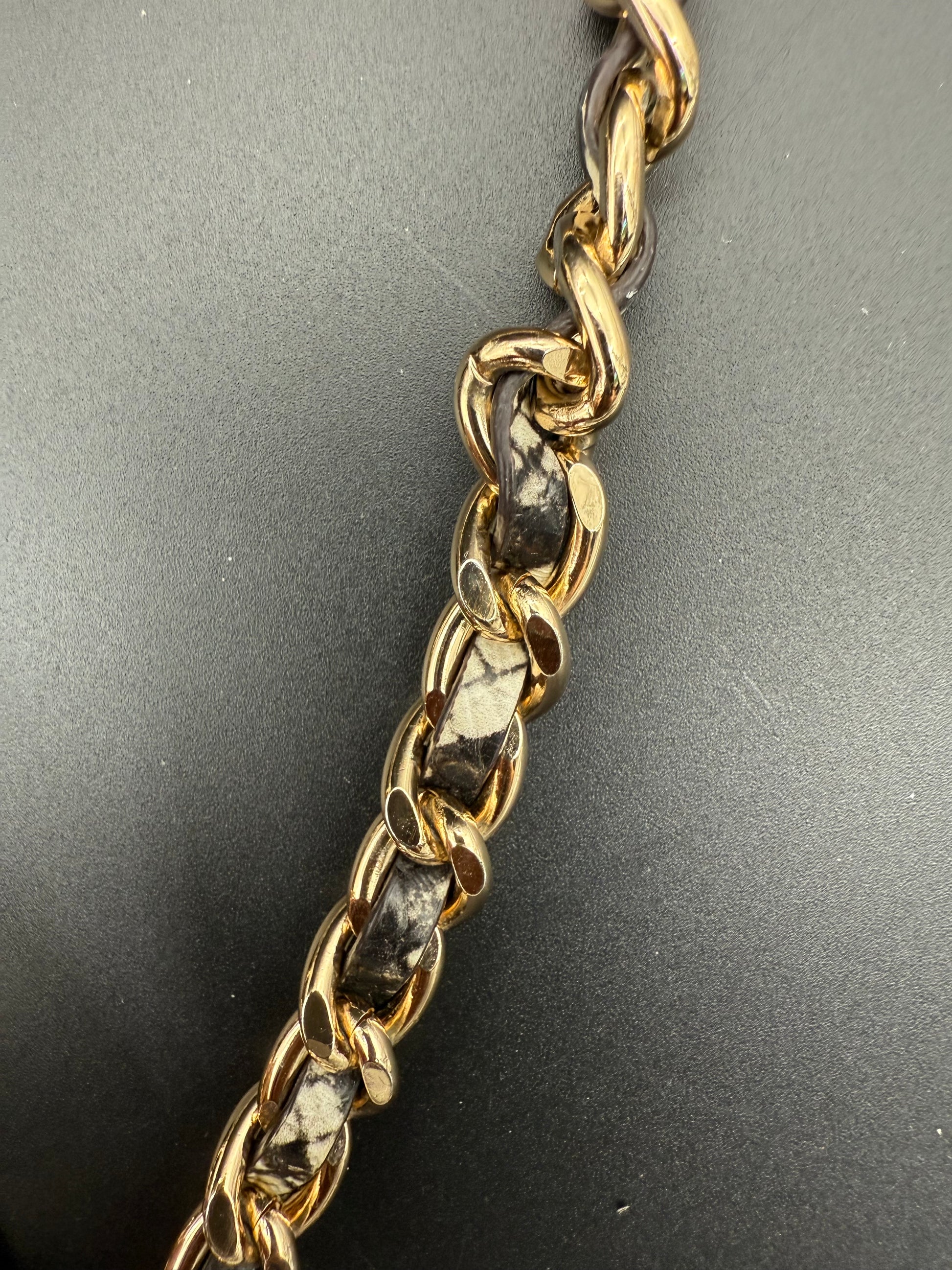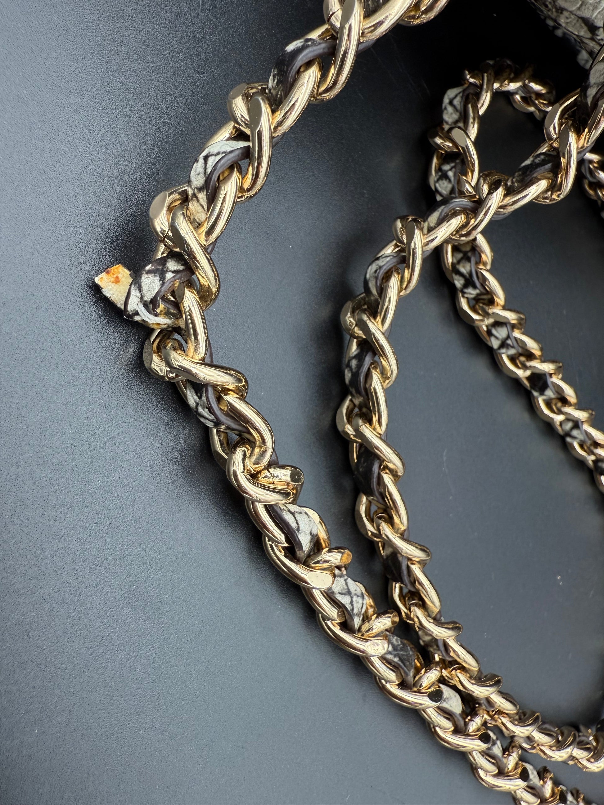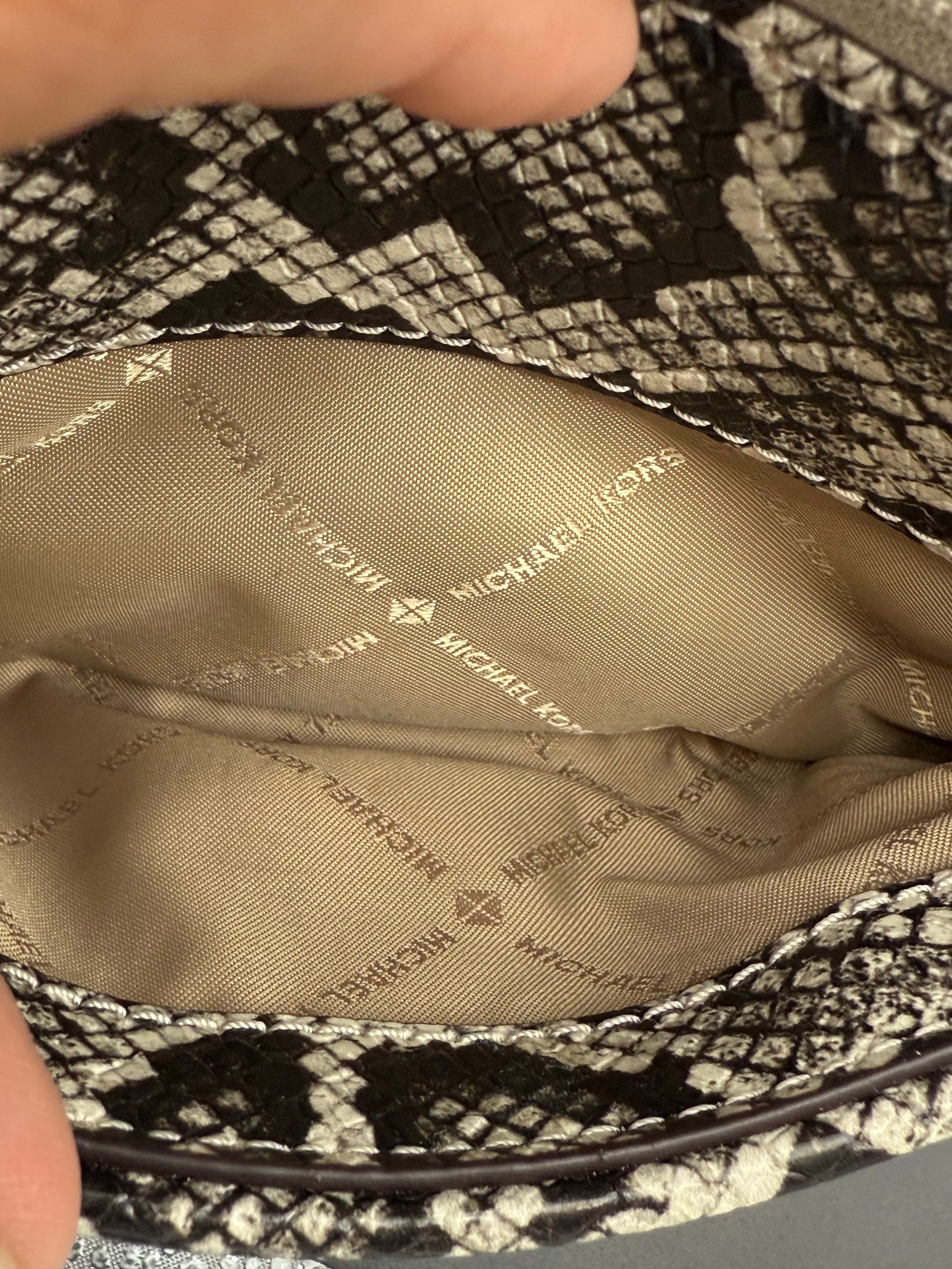 This is a Michael Kors handbag featuring a snakeskin pattern with a gold-toned chain strap and clasp. The clasp is adorned with the brand's logo, adding a sophisticated touch to the chic design.