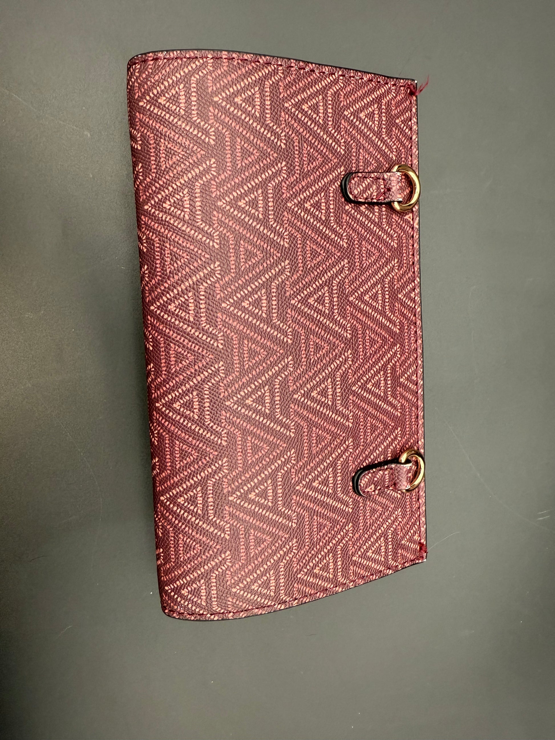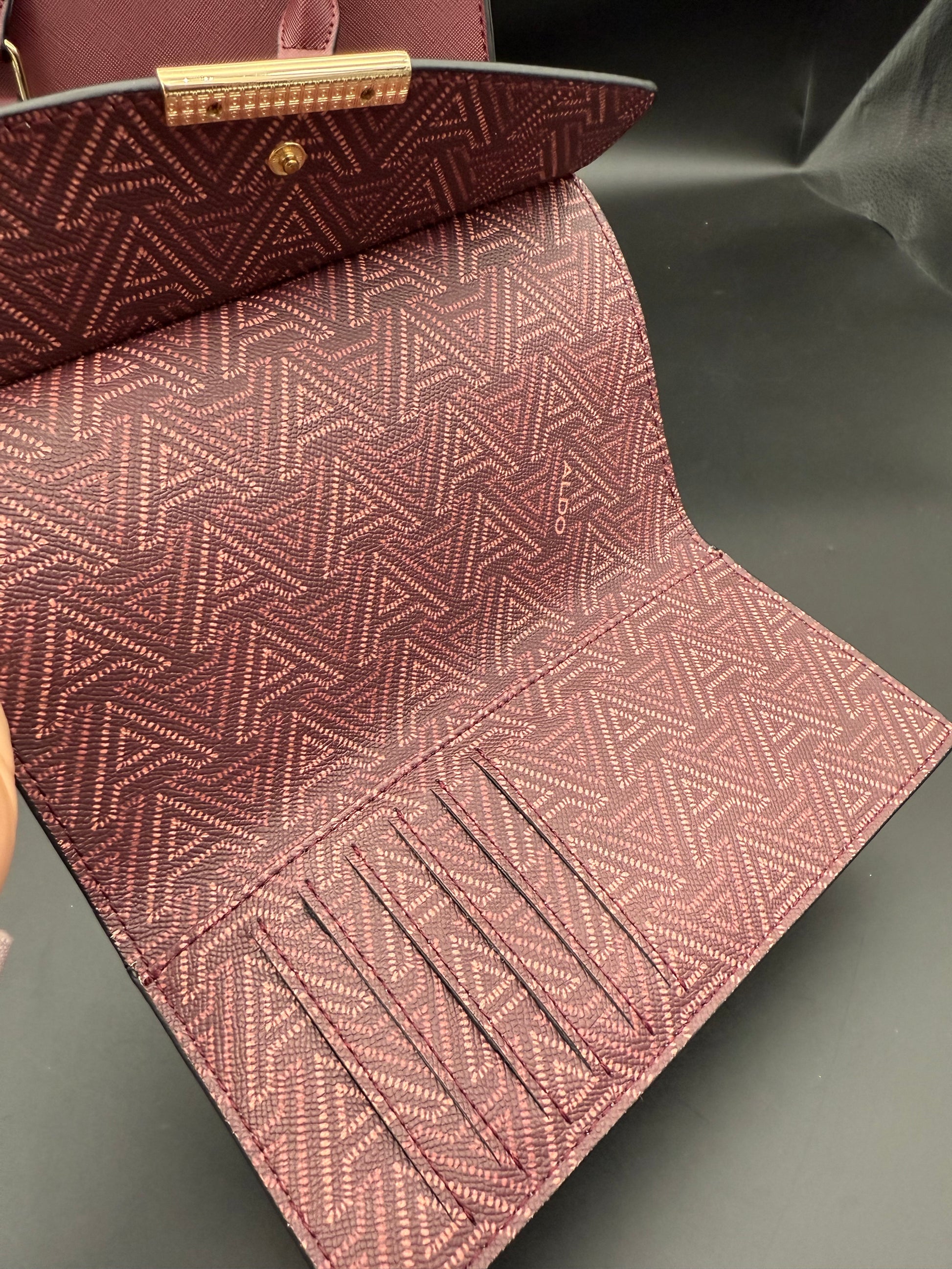 This ALDO handbag in a rich burgundy hue features a structured rectangular shape with smooth, crosshatched texture, likely made from synthetic leather. It has dual top handles secured with gold-tone square buckles, a zippered main compartment, comes with a matching Wallet