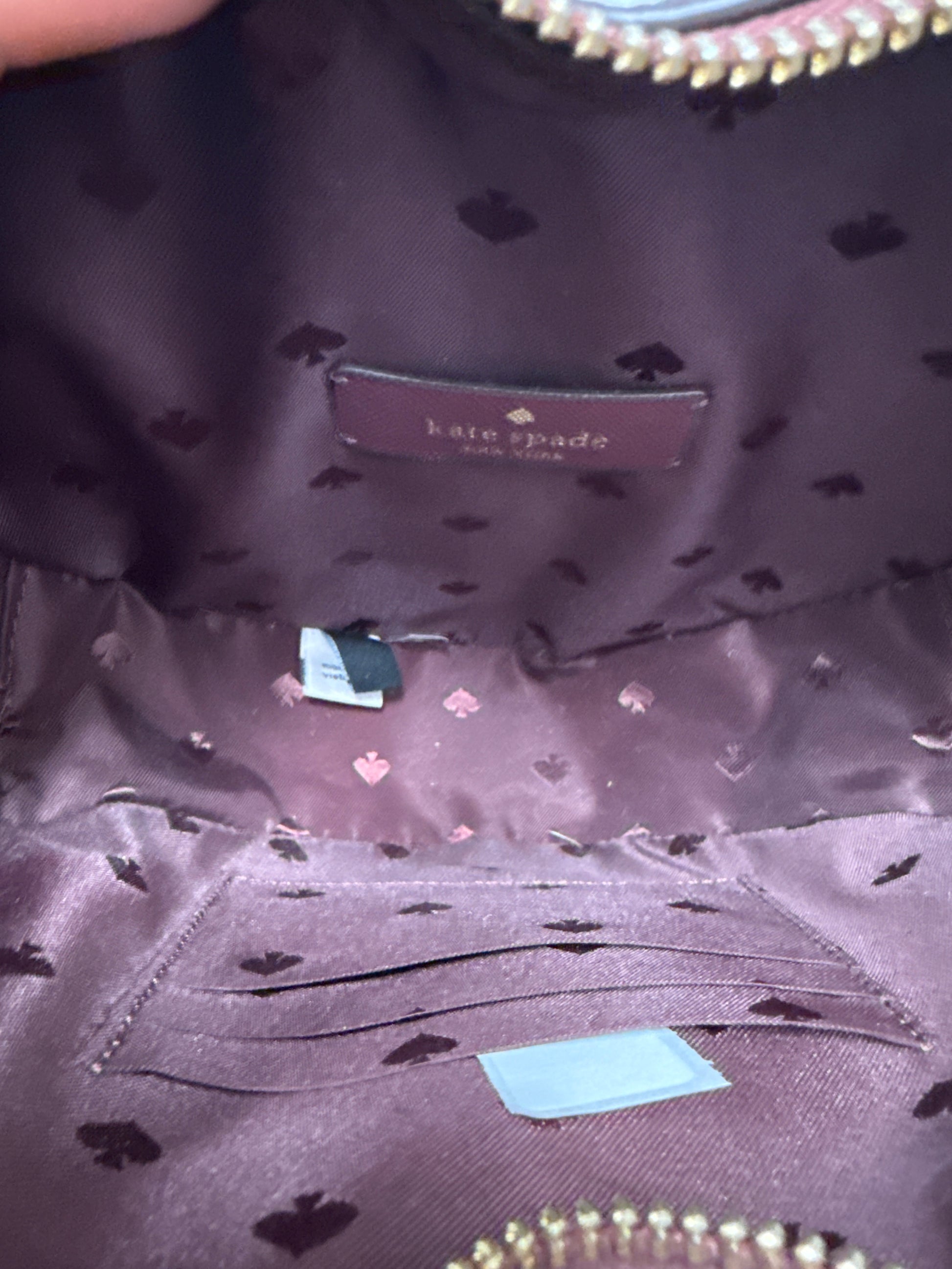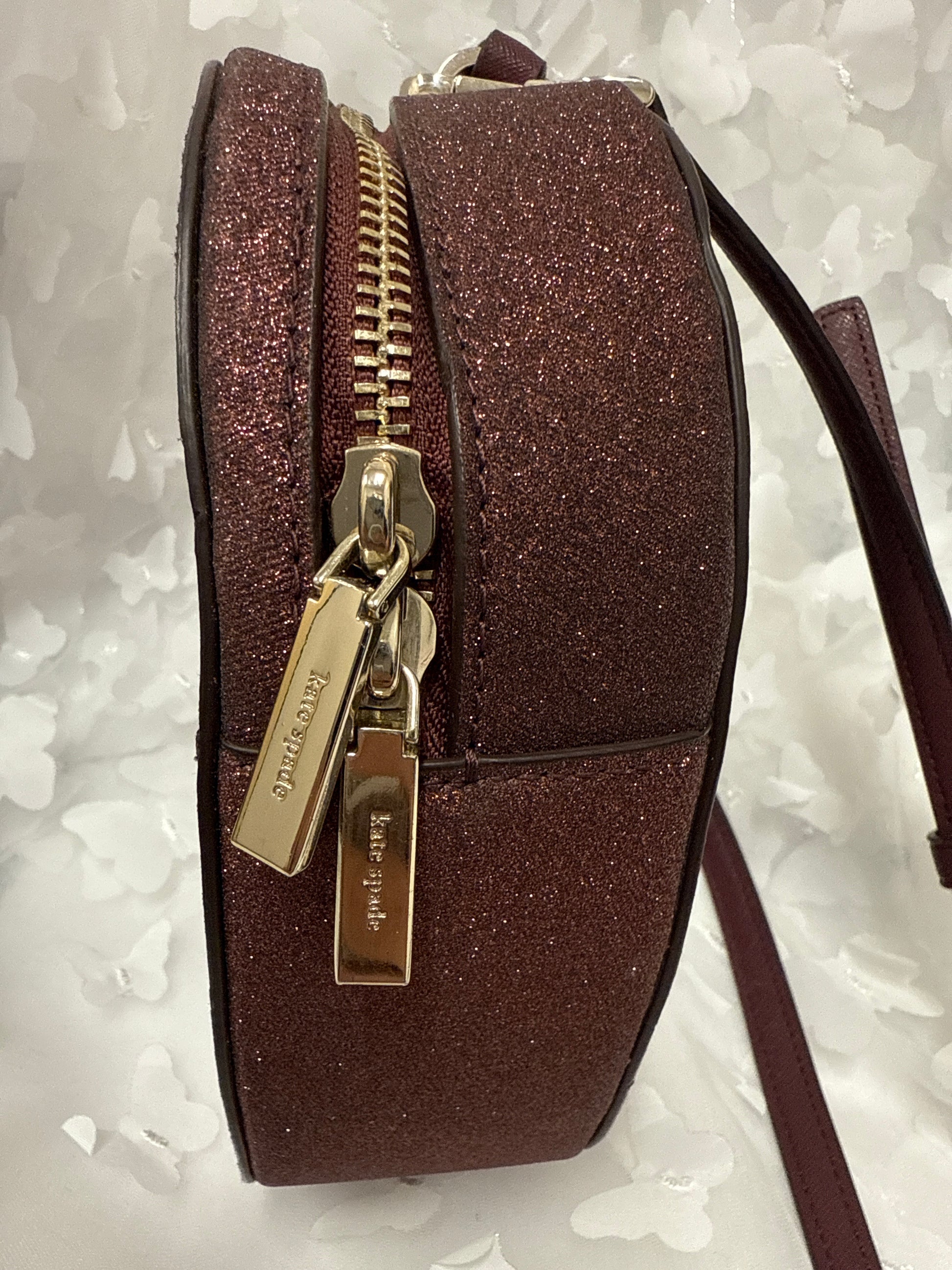 Kate Spade heart-shaped crossbody bag features a shimmering, glittery finish with a rich burgundy hue, both casual and dressy occasions.