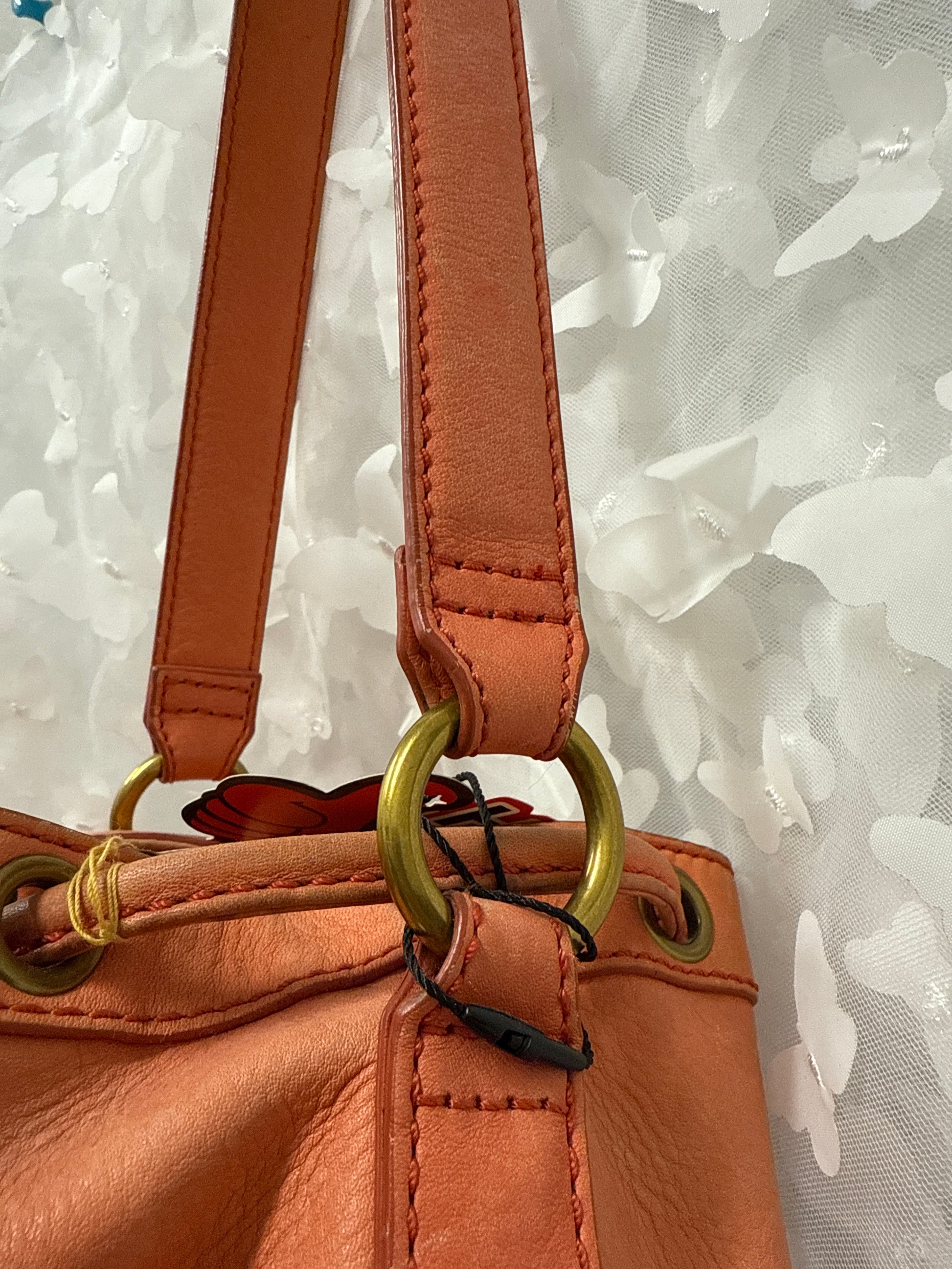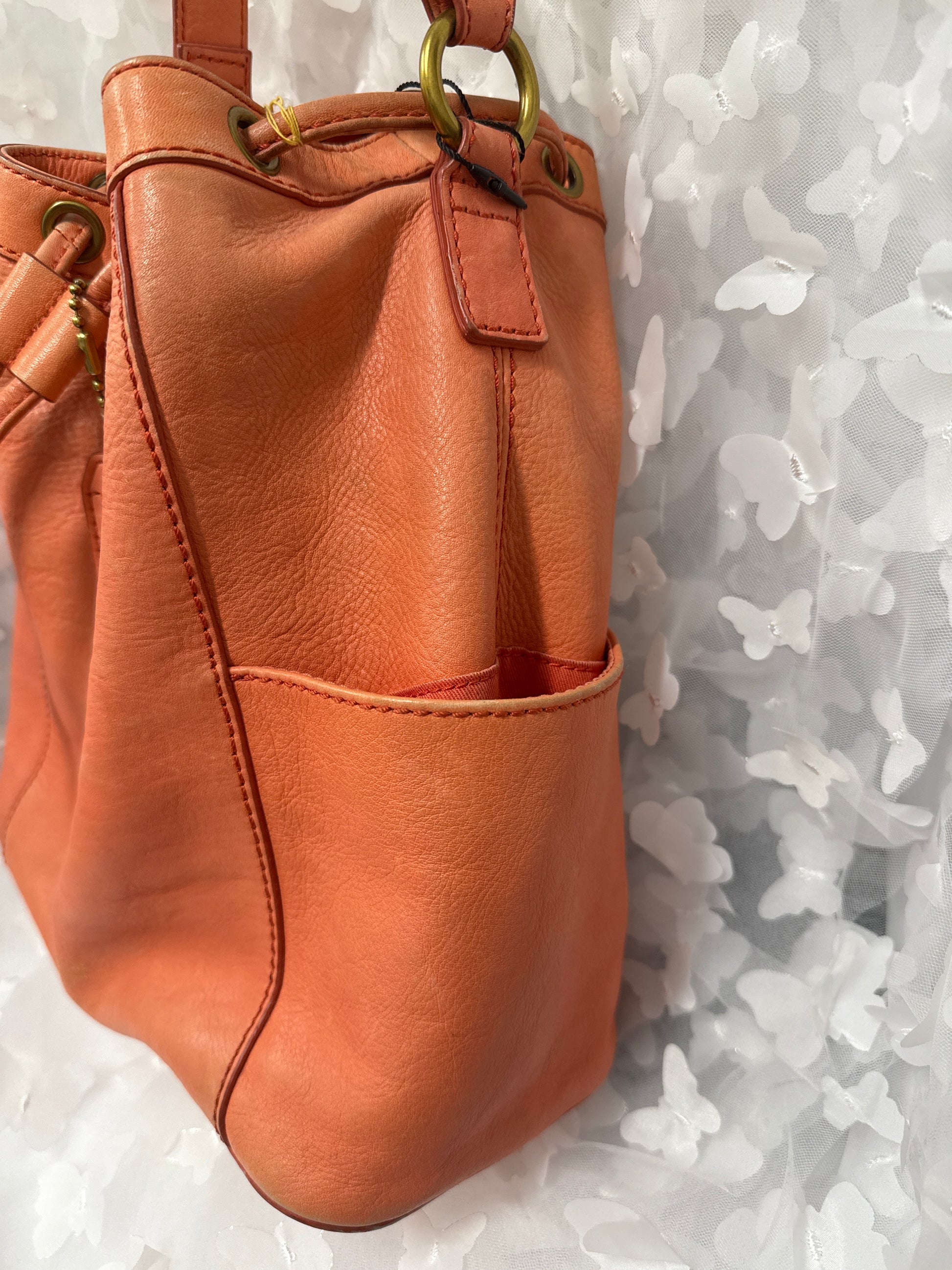 This is a Fossil leather drawstring shoulder bag in a warm orange hue and this bag features a relaxed silhouette with functional side pockets and a leather tag accent.