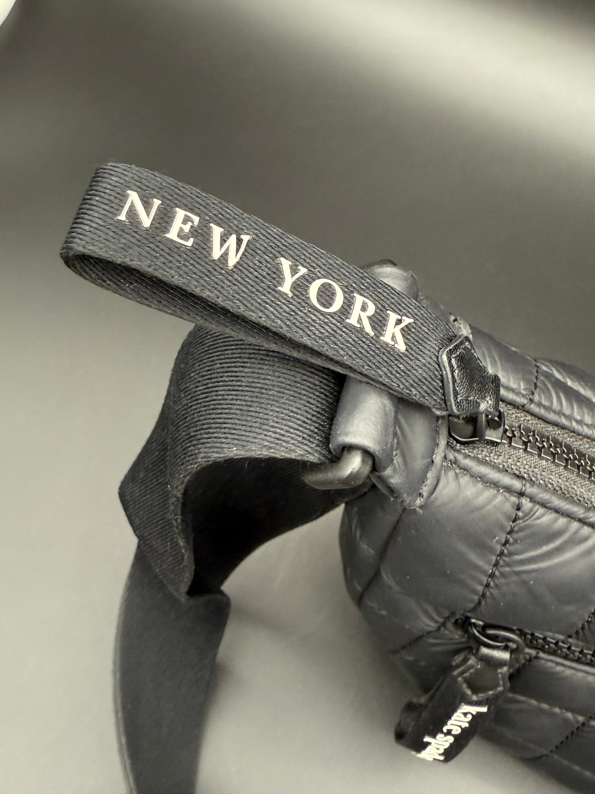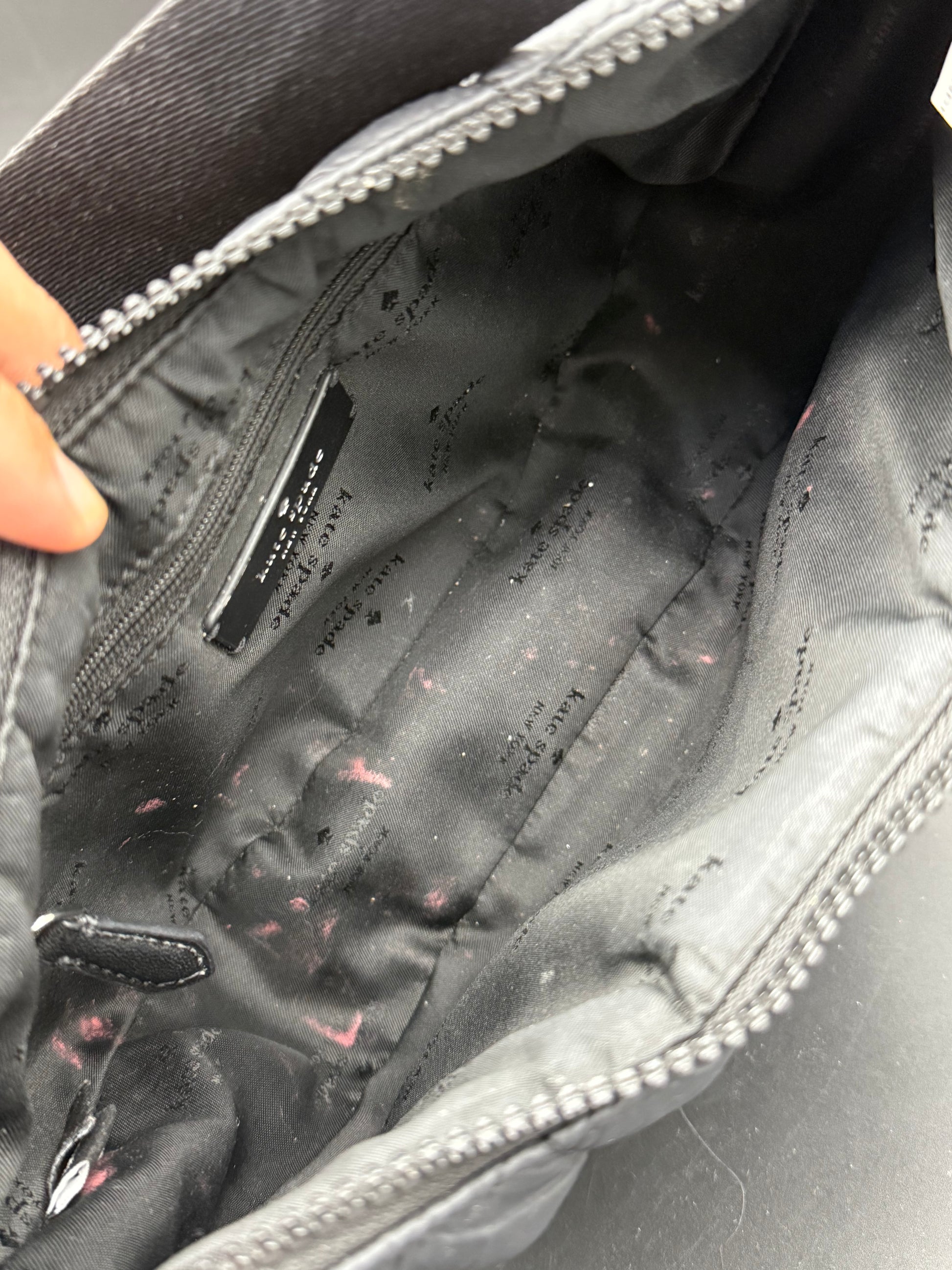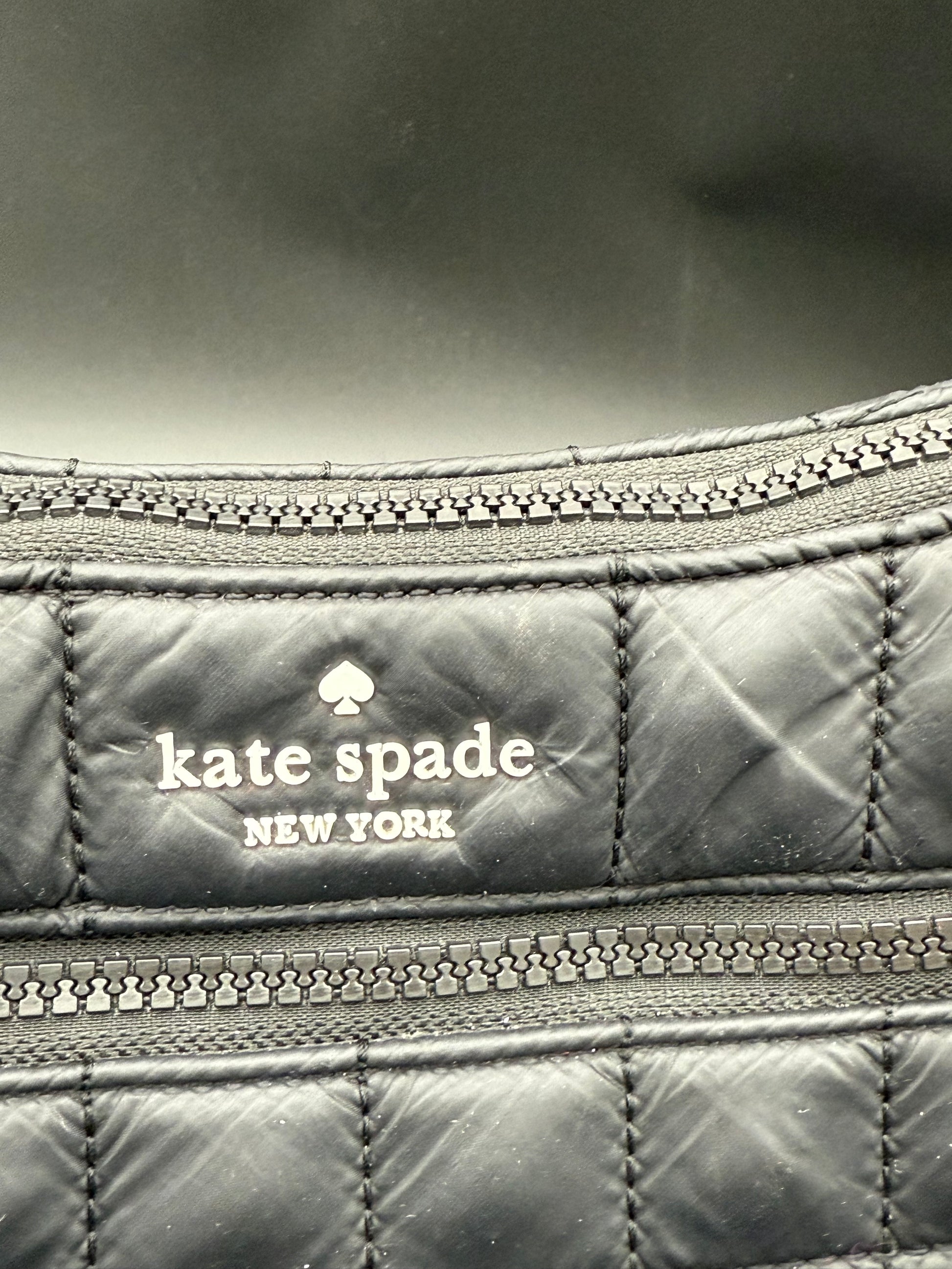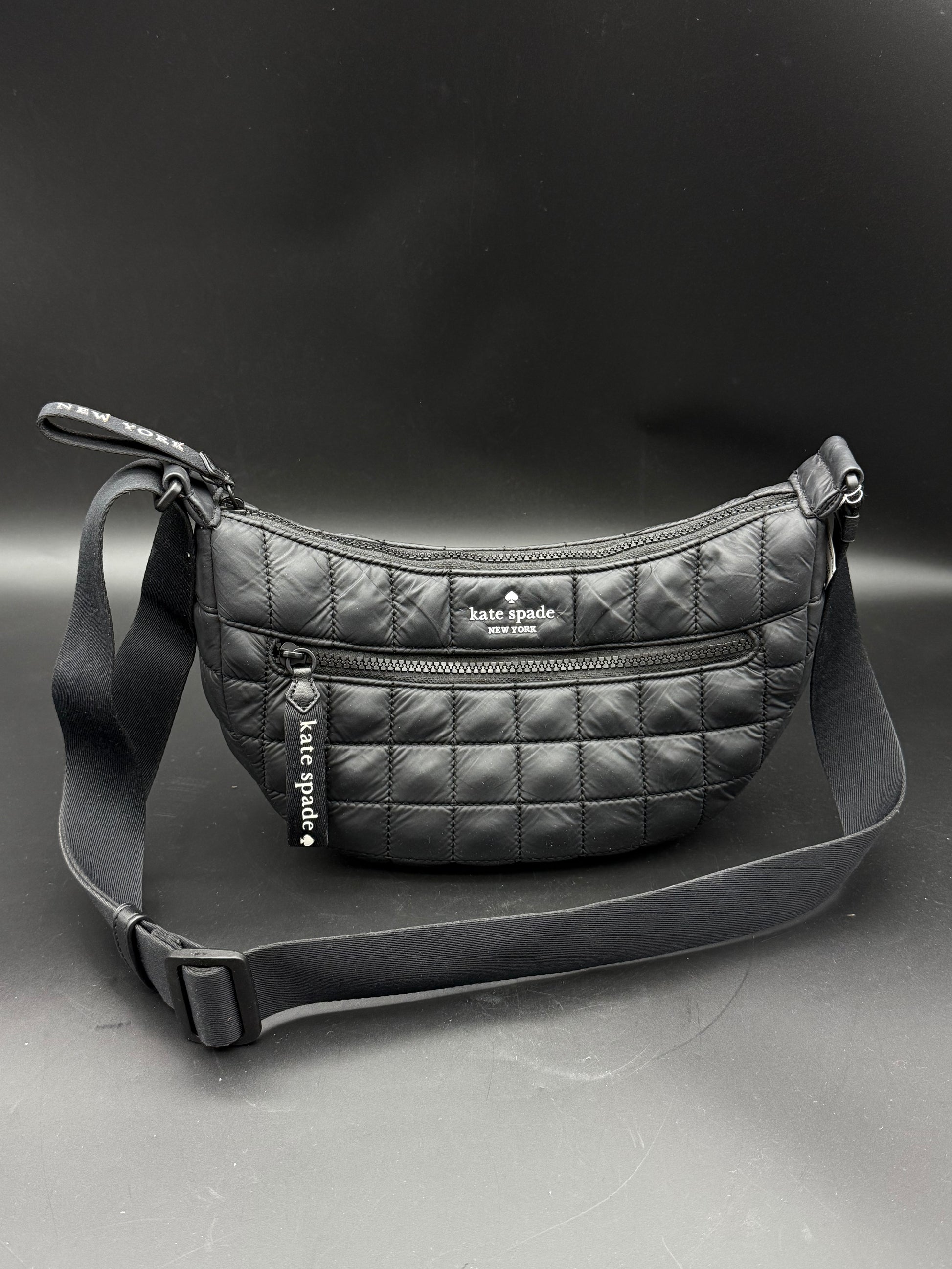 This is a quilted black crossbody bag from Kate Spade New York. Its compact design features a front zip pocket, adjustable strap, and the brand's signature logo on the front.