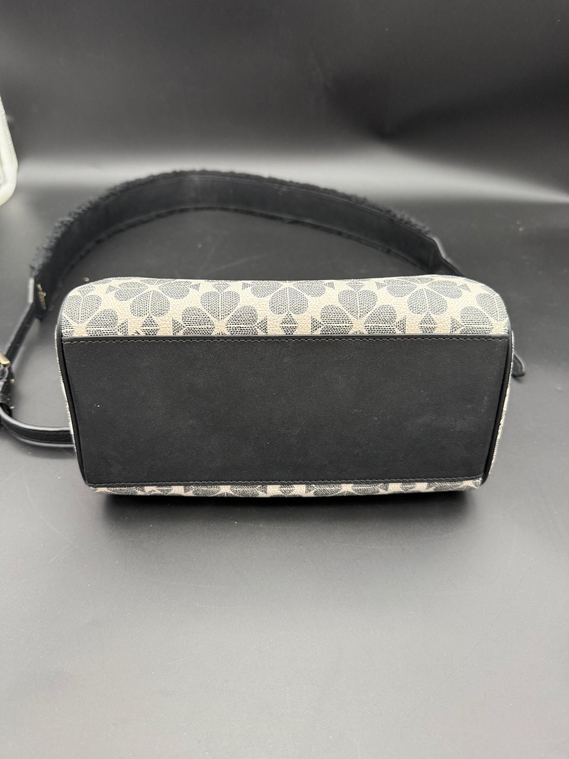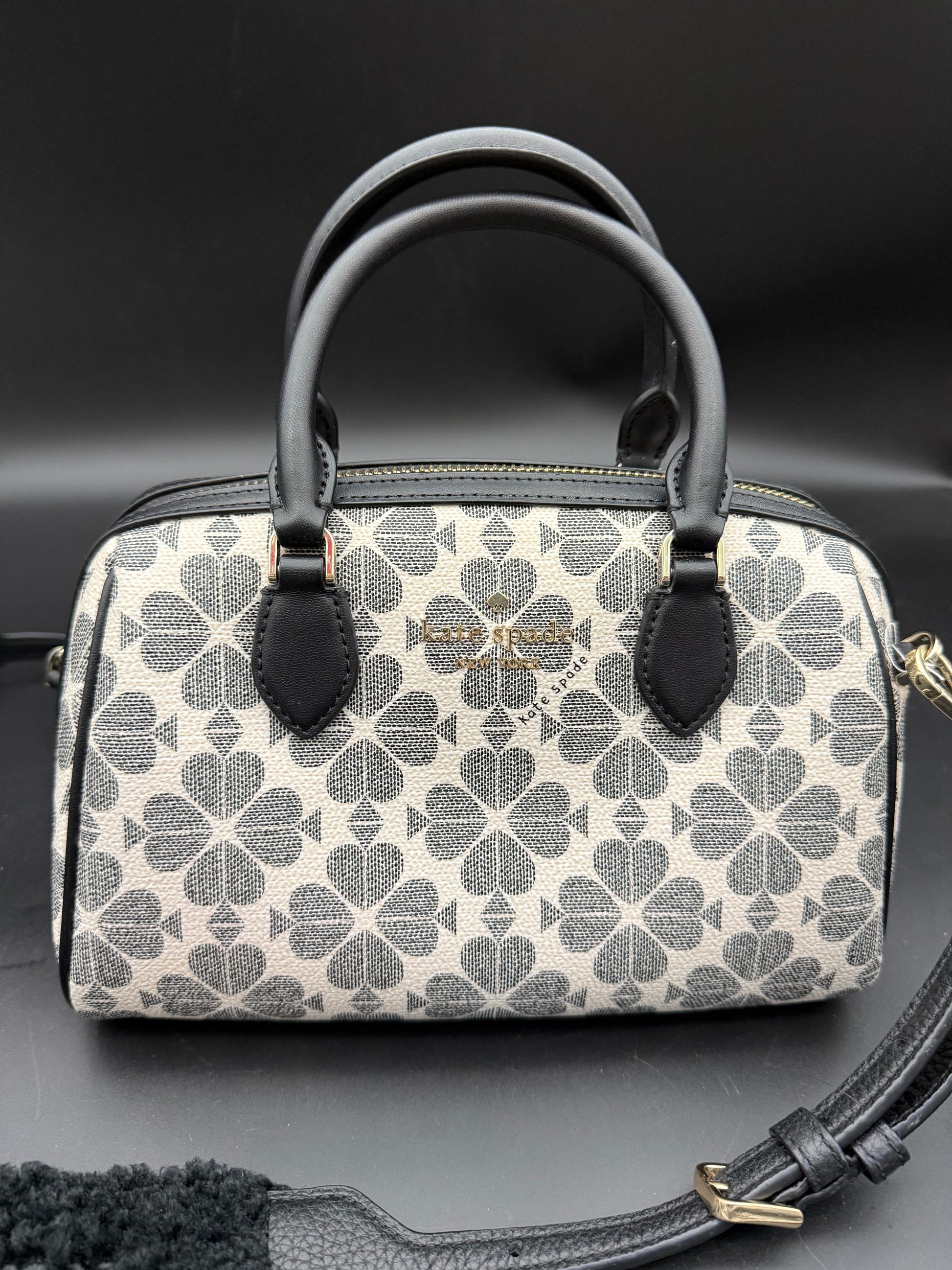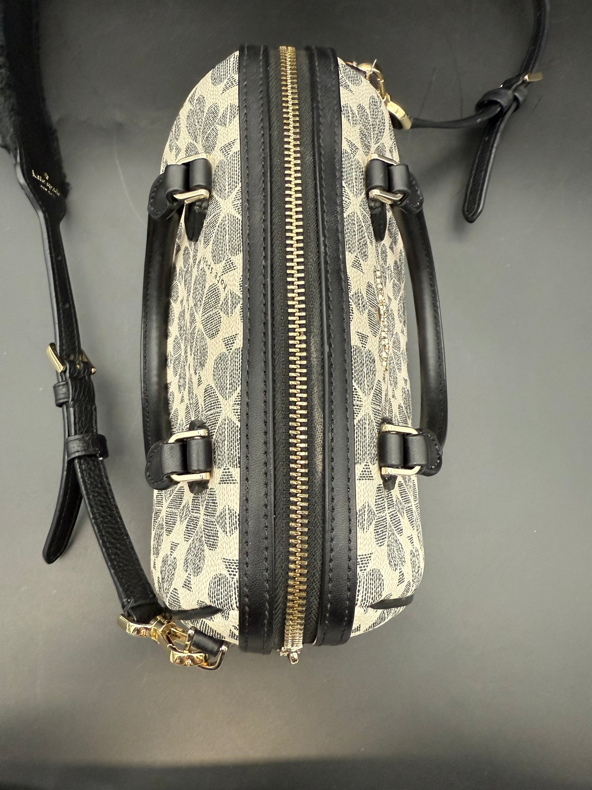 This Kate Spade handbag features a distinctive spade floral pattern with black leather handles and gold-tone hardware. Its structured shape and detachable strap make it versatile for both hand-carry and crossbody wear.