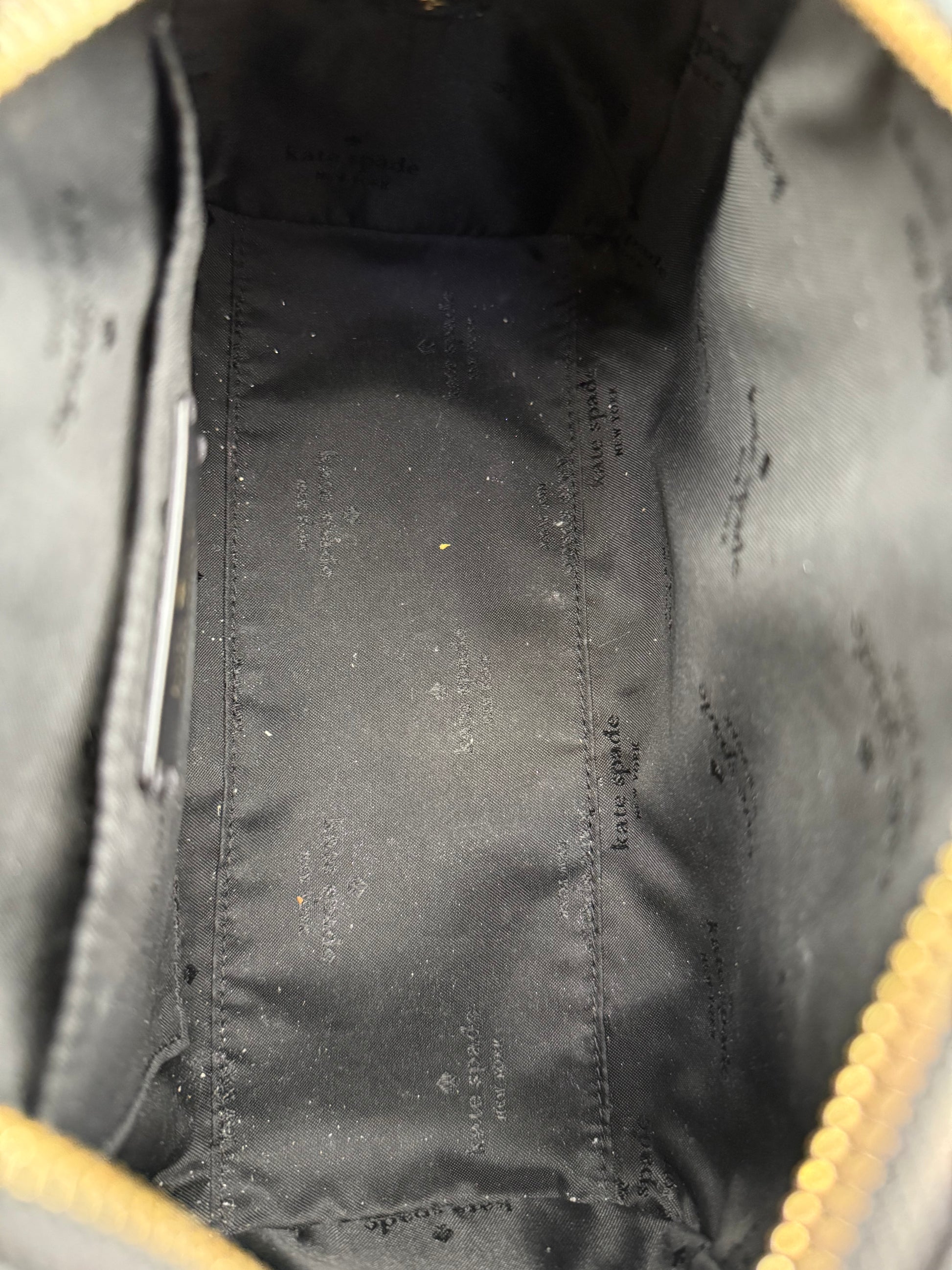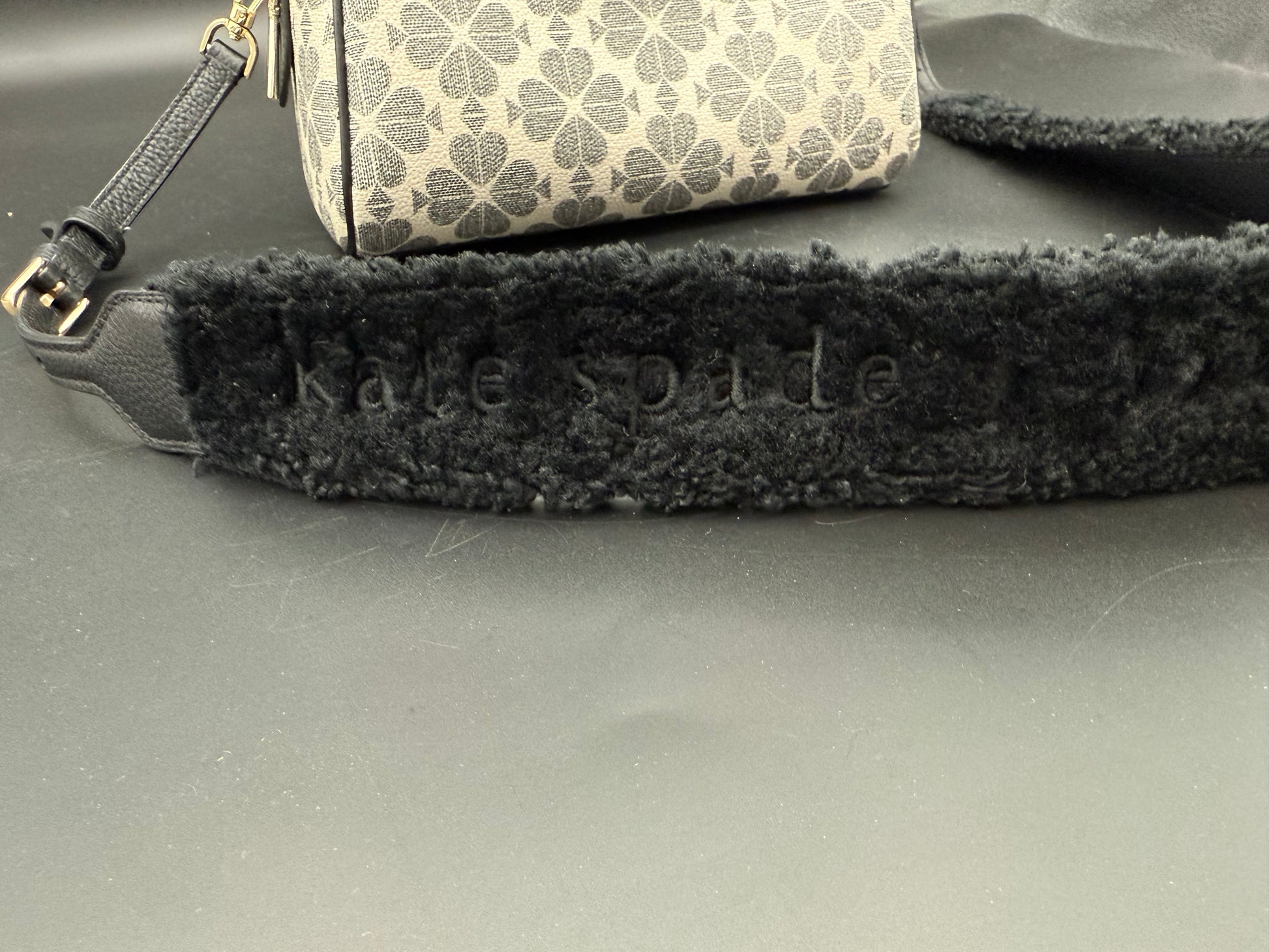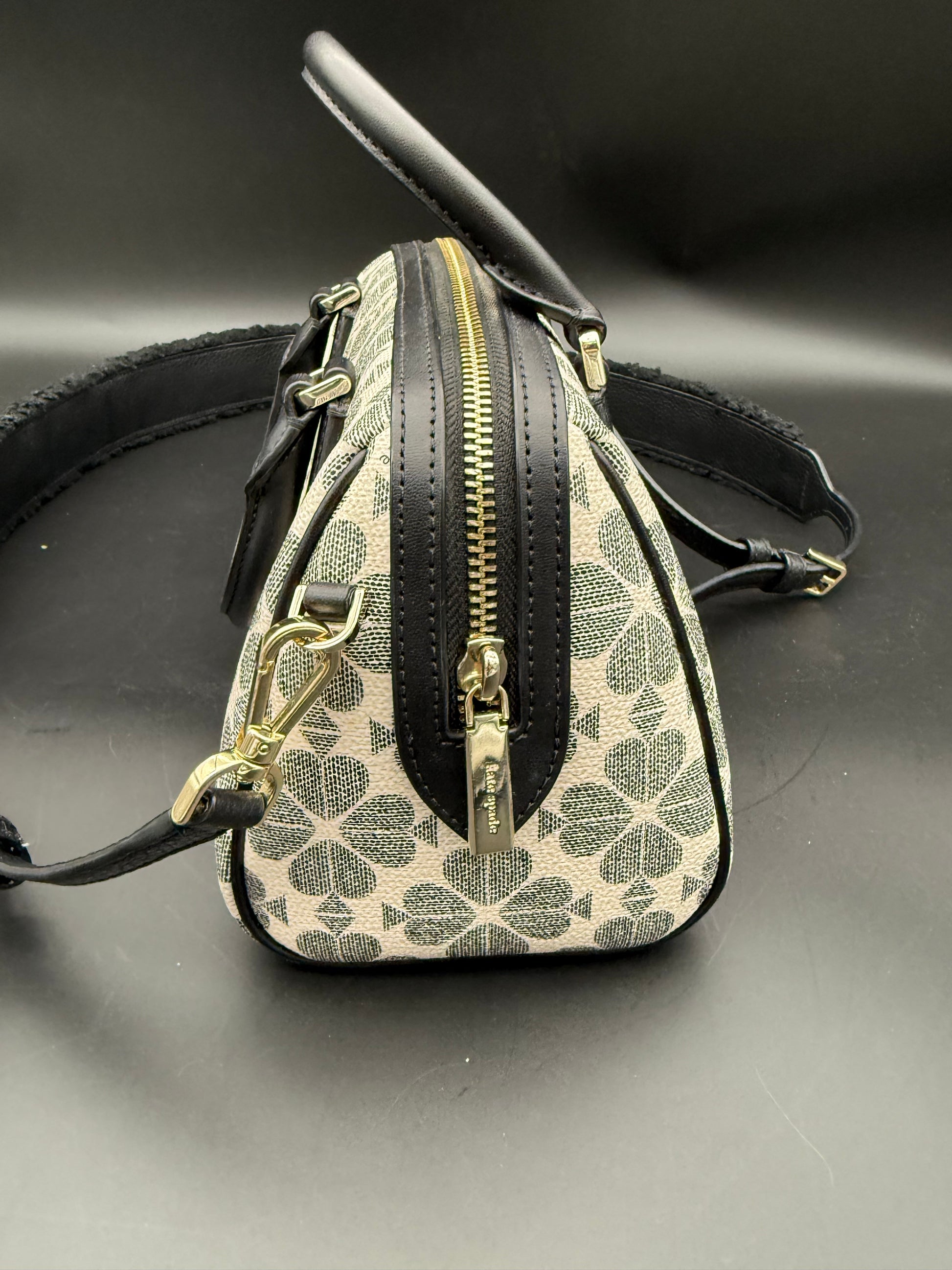 This Kate Spade handbag features a distinctive spade floral pattern with black leather handles and gold-tone hardware. Its structured shape and detachable strap make it versatile for both hand-carry and crossbody wear.
