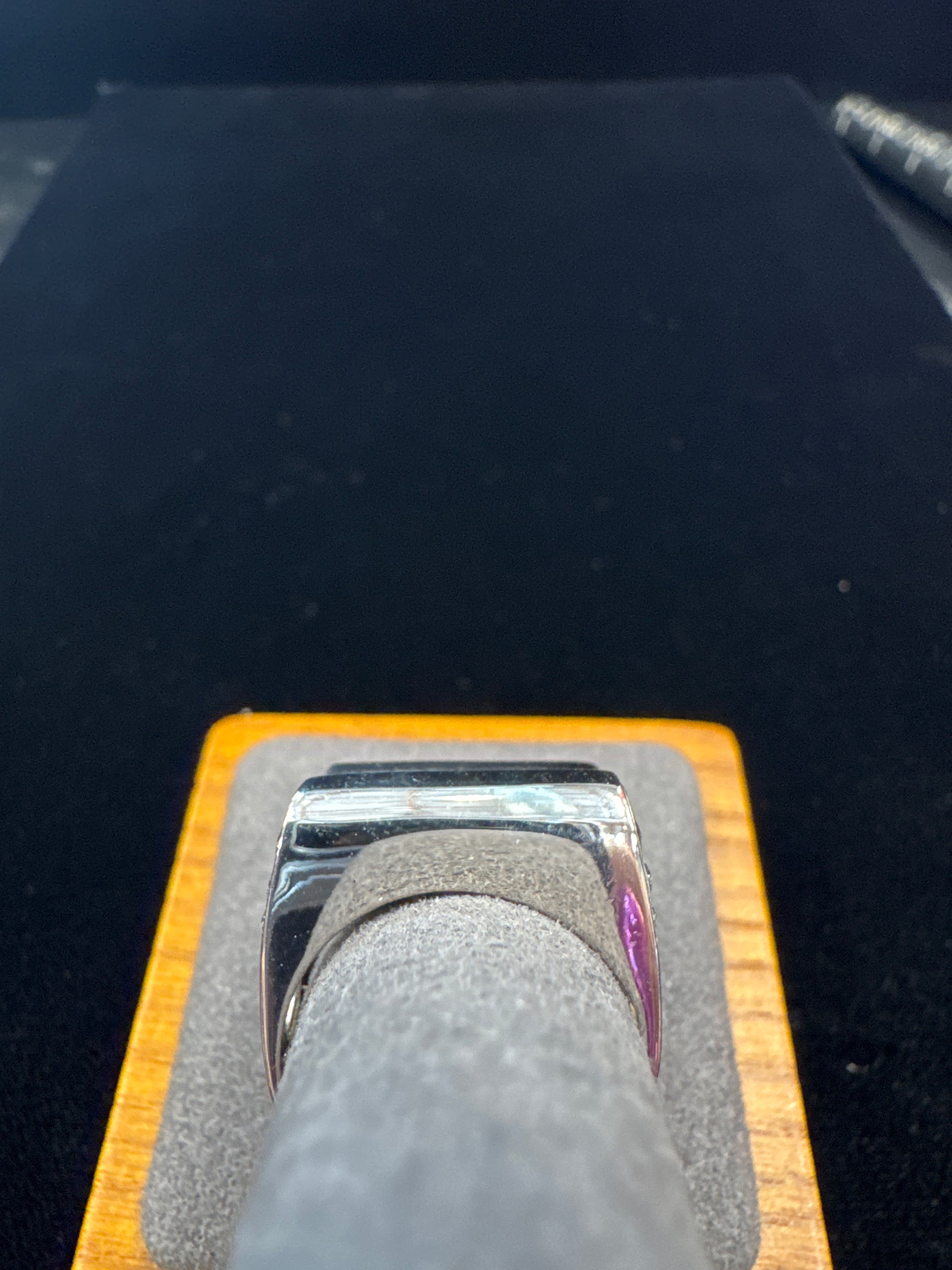 14kt white gold, 7.7 grams with diamonds and blue stones