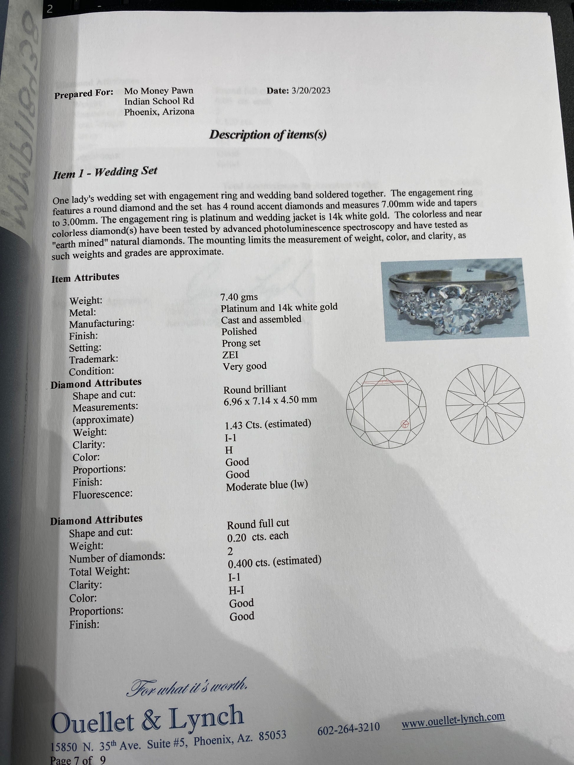 7.4 Grams Of Platinum & 14k White Gold Diamond Wedding Set. Wedding Set Has A 1.43CT Round Brilliant Diamond In The Center With A Clarity Of (I-1-H)Wedding Set Also Has 0.40CT Round Diamonds On A 14k White Gold Jacket With A Clarity & Color Of (I-1-H/I). Wedding Set also Has 0.12CTW Round Diamonds On A 14k White Gold Jacket With A Clarity & Color Of (I-1-H/I) Engagement Ring & Jacket Are Soldered Together. Wedding Set Is A Size 6.5 & Comes With Appraisal.