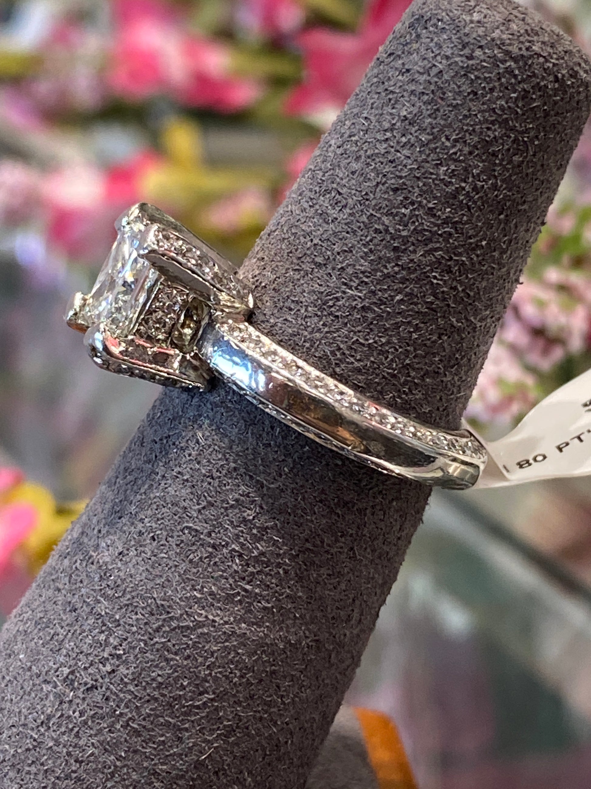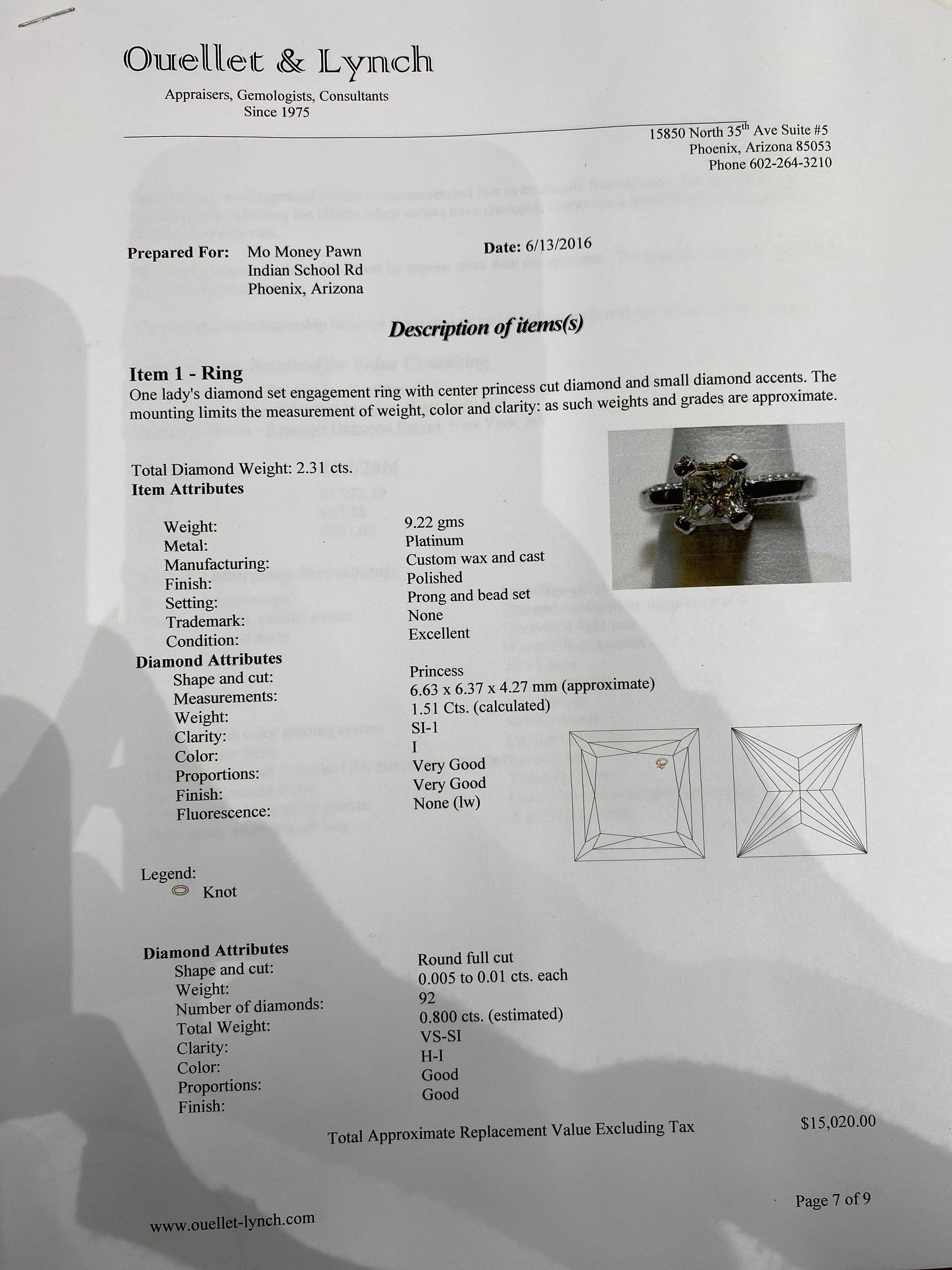 9.22 Grams Of Platinum Diamond Engagement Ring. Engagement Ring Has A Center Princess Cut Diamond That Measures 1.51CT & Has A Clarity & Color Of (SI-1-I). Engagement Ring Also Has Side Diamonds Round The Head & Band With A Diamond Weight Of 0.80CTW & A Clarity & Color Of (VS-SI) (H-I). Engagement Ring Is A Size 5.5. Engagement Ring Comes With An Appraisal.
