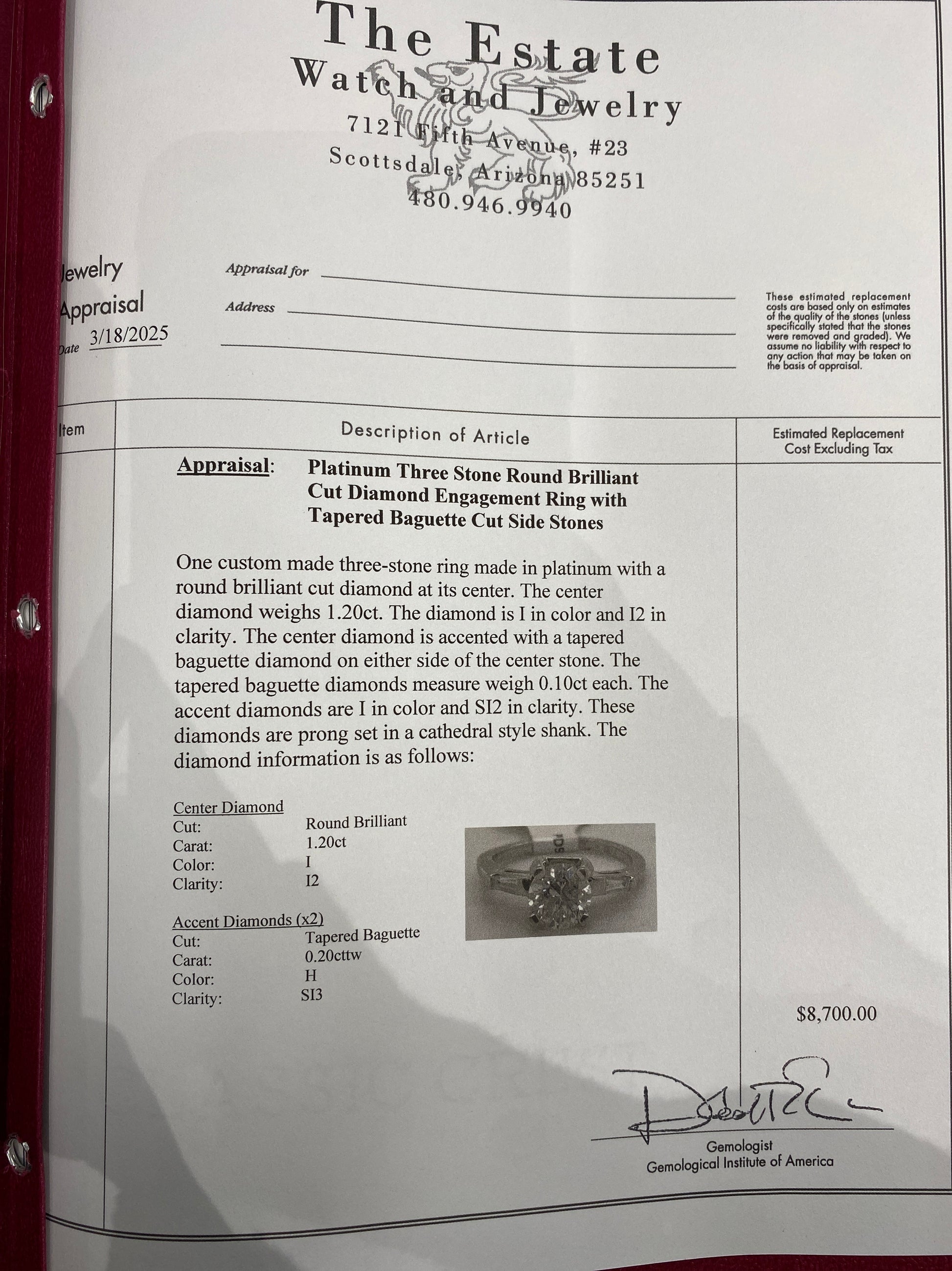 5.3 Grams Of Platinum Diamond Engagement Ring. Engagement Ring Has A 1.20CT Round Brilliant Cut Diamond In The Center With A Clarity & Color Of (I-2-I). Engagement Ring Also Has Two 0.20CTW Tapered Baguette Diamonds On The Sides With A Clarity & Color Of (SI-2-I). Engagement Ring Is A Size 5.5 & Comes With An Appraisal.