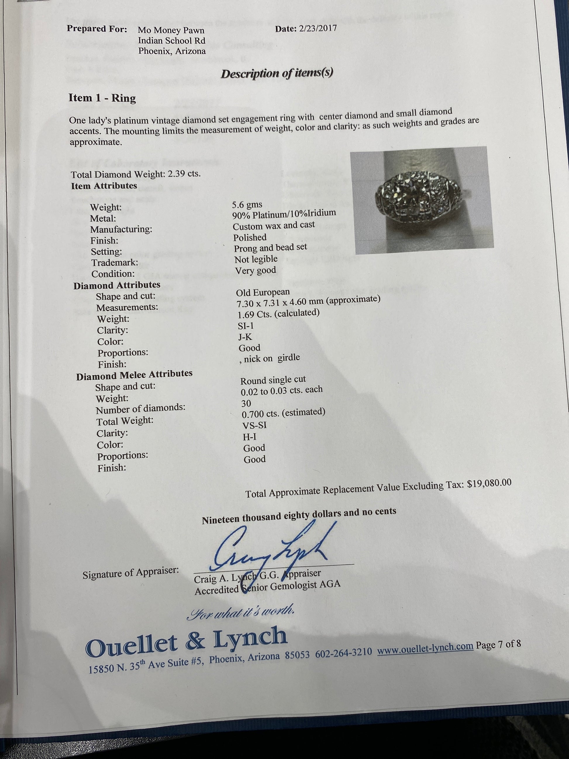 5.6 Grams Of Platinum Lady’s Vintage Diamond Ring. Ring Has A Old European Diamond In The Center That Is A 1.69CT With A Clarity & Color Of (SI - 1 -K). Ring Also Has Round Diamonds On The Side That Measure 0.70CTW With A Clarity Of (VS-SI) & Color Of (H-I). Ring Is A Size 7 & Comes With An Appraisal.