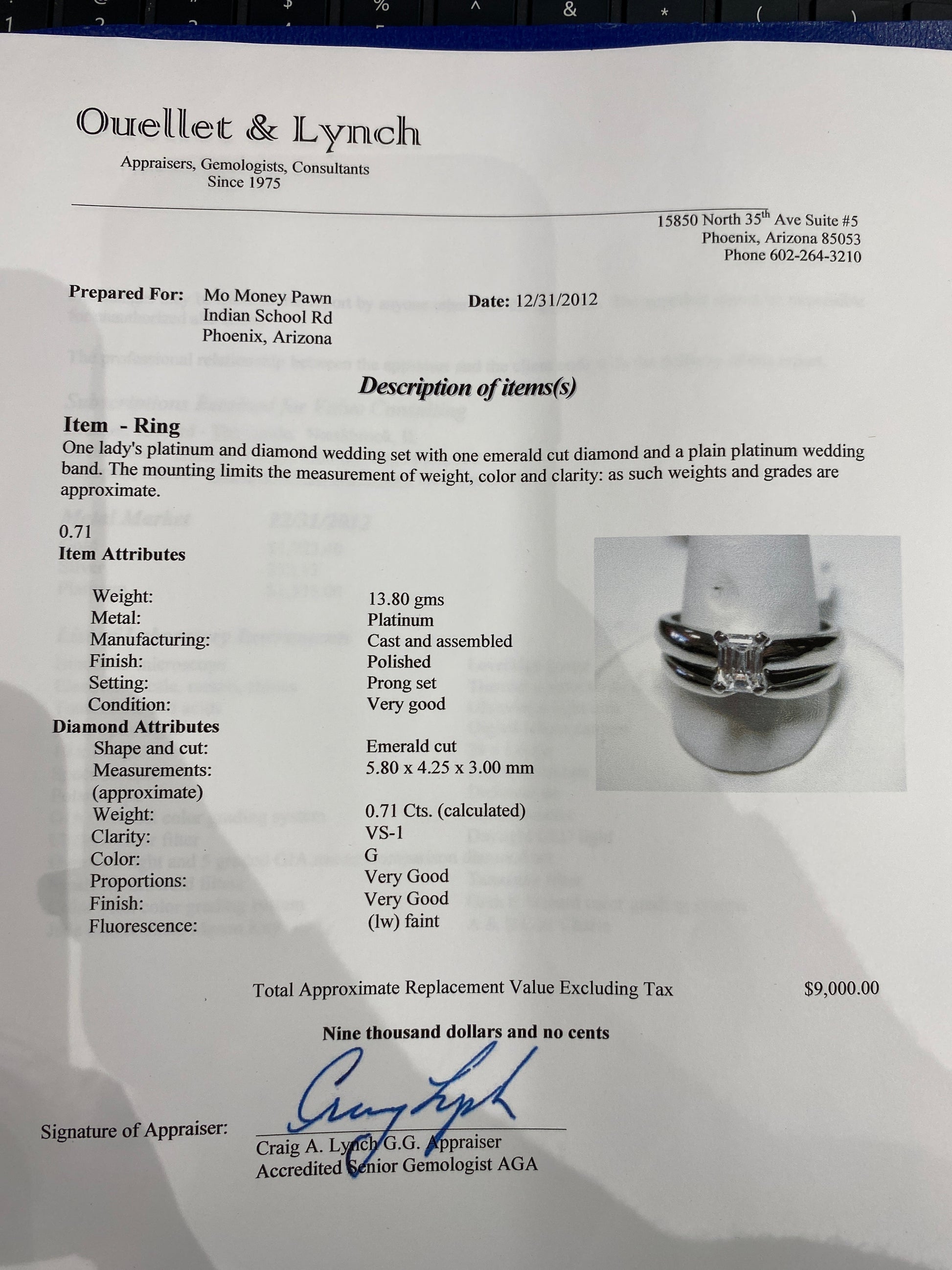 13.8 Grams Of Platinum Diamond Engagement Ring. Engagement Ring Has A 0.71CT Emerald Cut Diamond On The Engagement Ring With A Clarity & Color Of (VS-1-G). Wedding Set Is A Size 7.5 & Comes With An Appraisal.