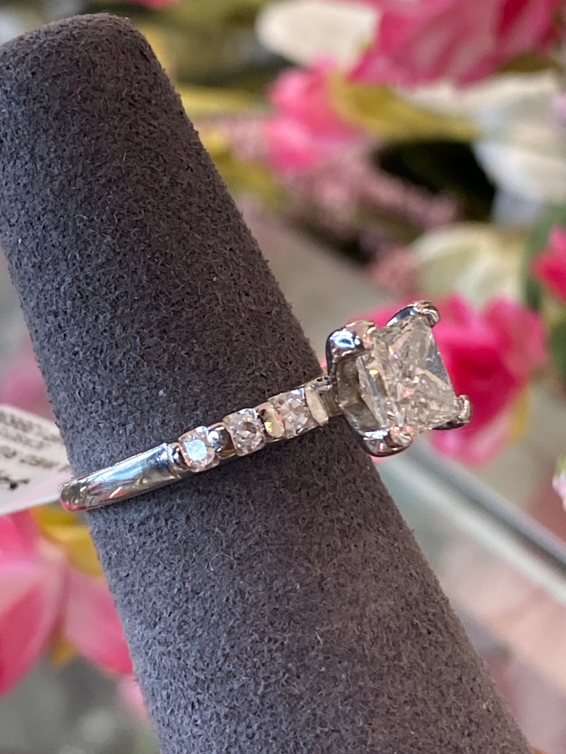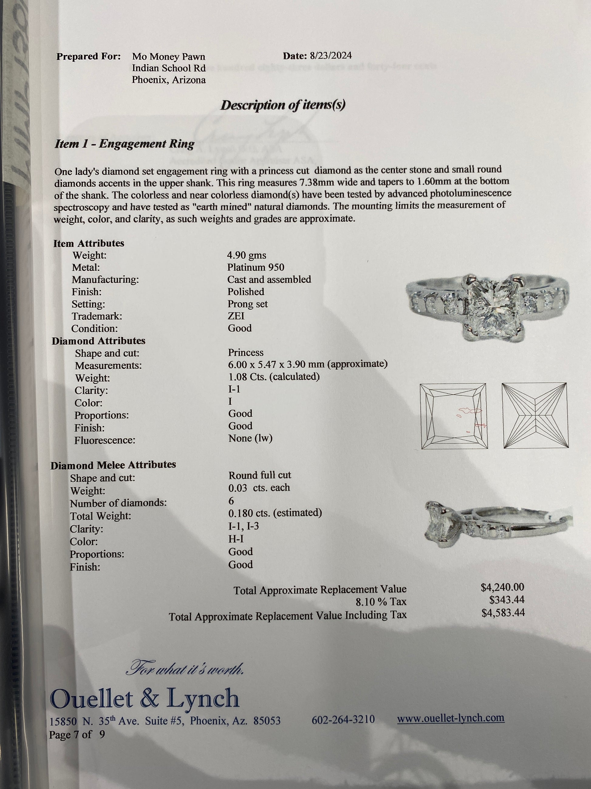 4.9 Grams Of Platinum Princess Cut Engagement Ring. Engagement Ring Has A 1.08CT Princess Cut Diamond With A Clarity & Color of (I-1-I). Engagement Ring Also Has 0.18CTW Of Round Diamonds On The Side. Engagement Ring Is A Size 5.75 & Cones With An Appraisal.