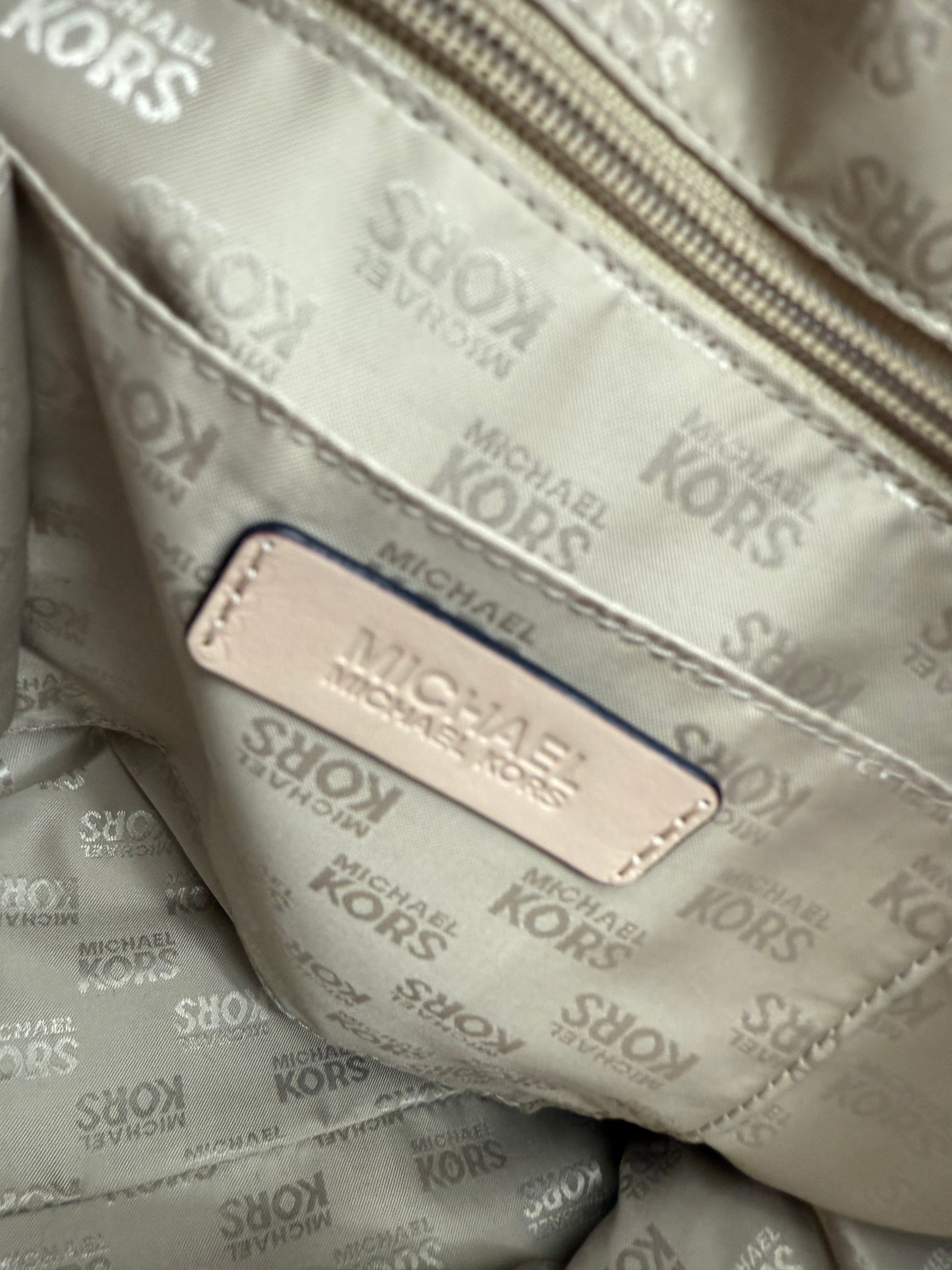 This is a medium-sized, navy blue leather handbag with pebbled texture. It features light tan and white dual shoulder straps, gold-tone hardware, side pockets, and a top zipper closure for secure storage.
