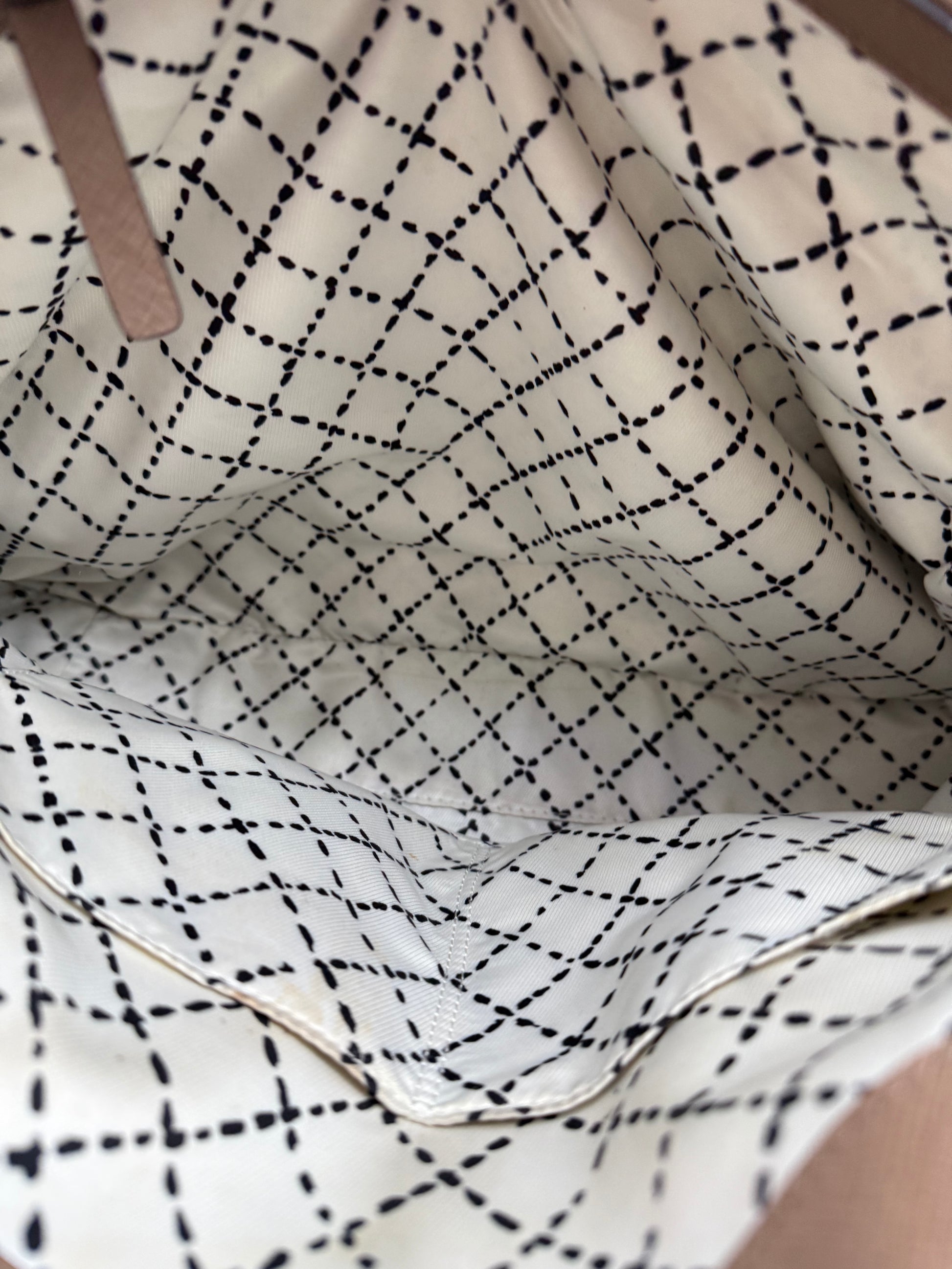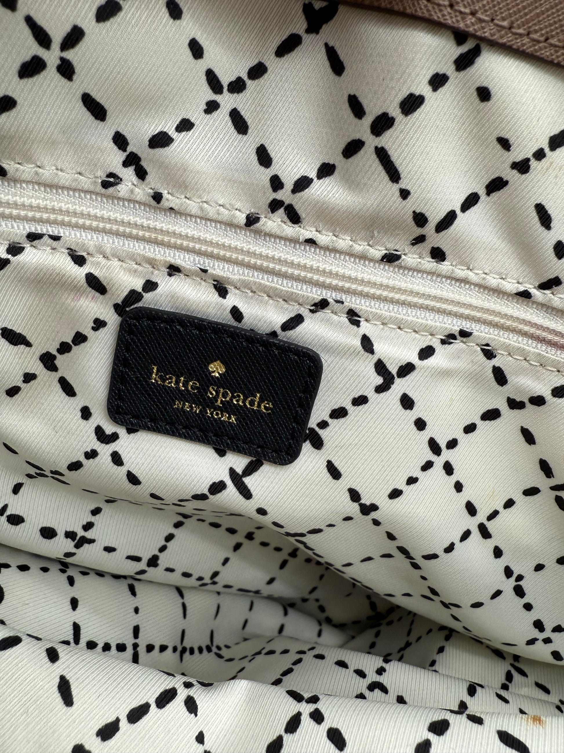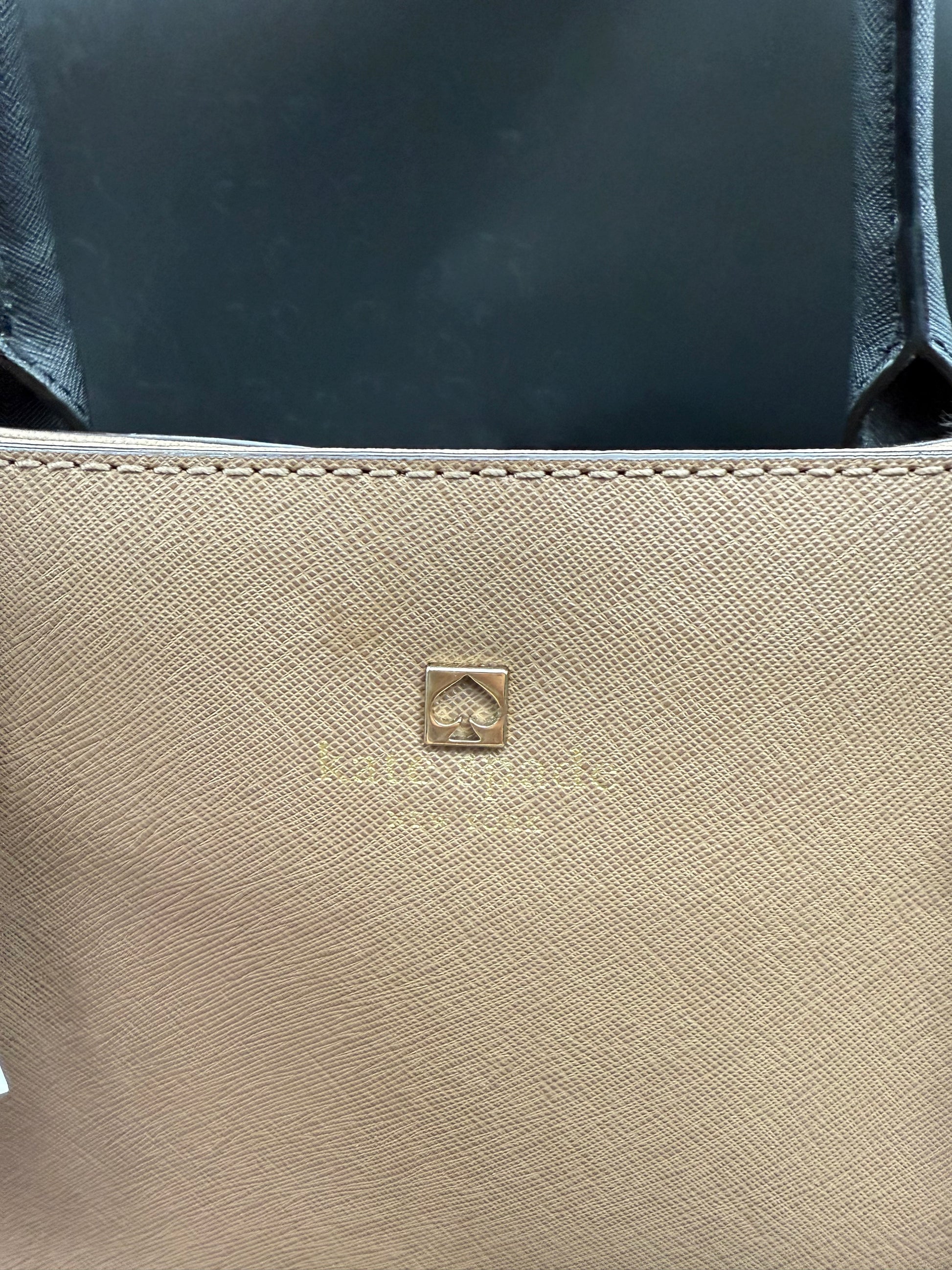 This is a Kate Spade New York handbag, featuring a two-tone design with tan and black colors. The bag has double handles with buckle accents, combining both elegance and functionality.