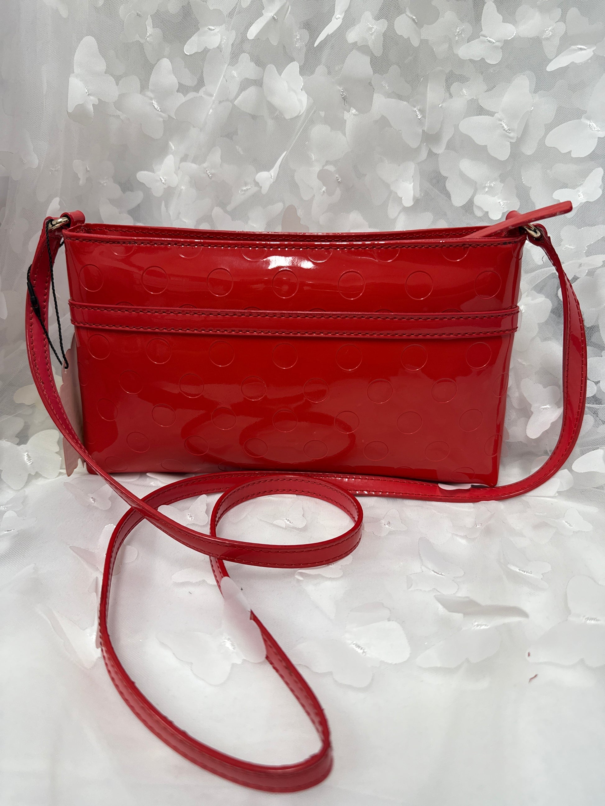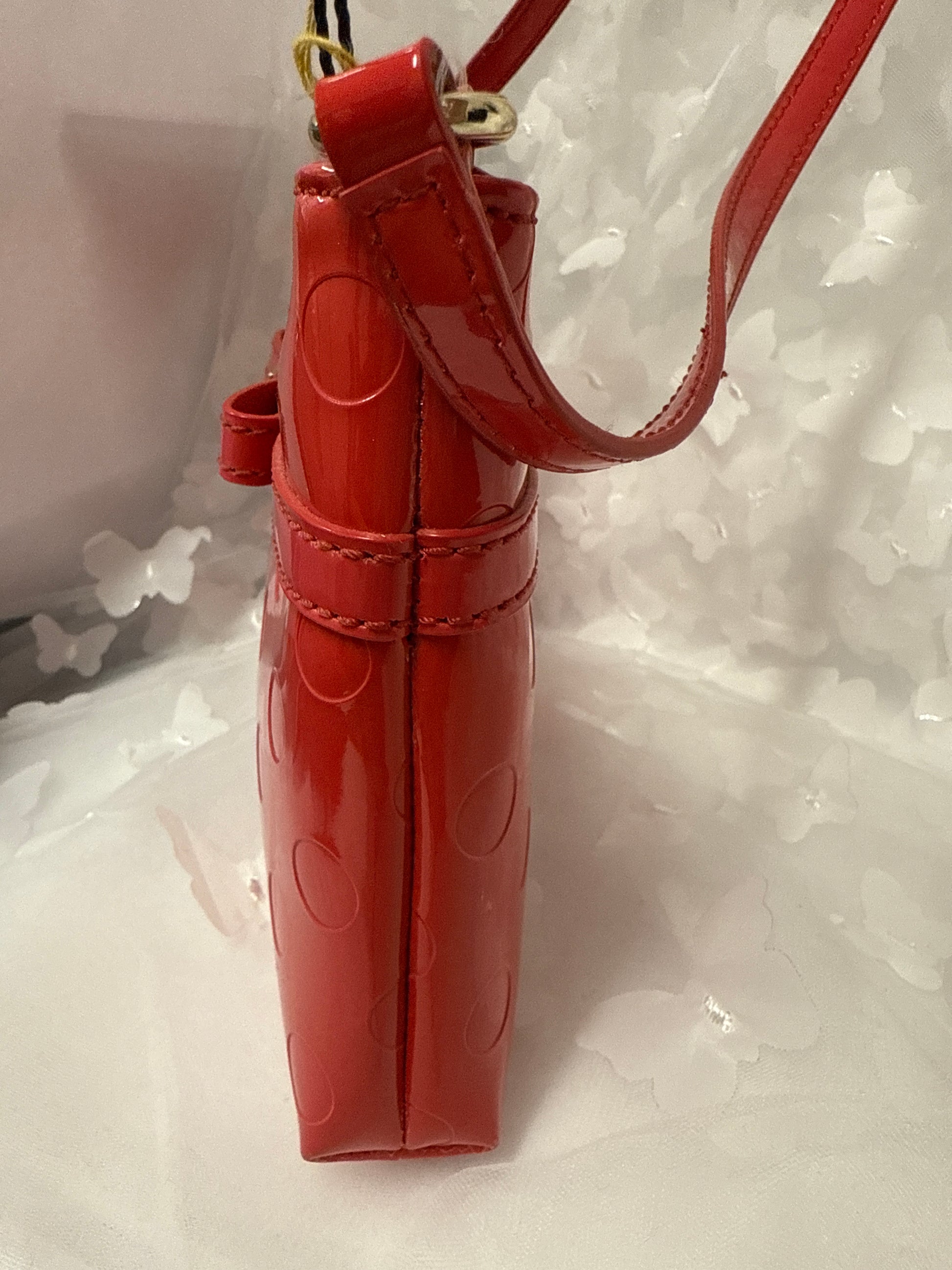 Kate Spade HandBag , small, glossy red handbag featuring a subtle polka dot pattern and a decorative bow with a metal accent, likely from Kate Spade, Pink strap, making it suitable for carrying as a shoulder or crossbody bag.