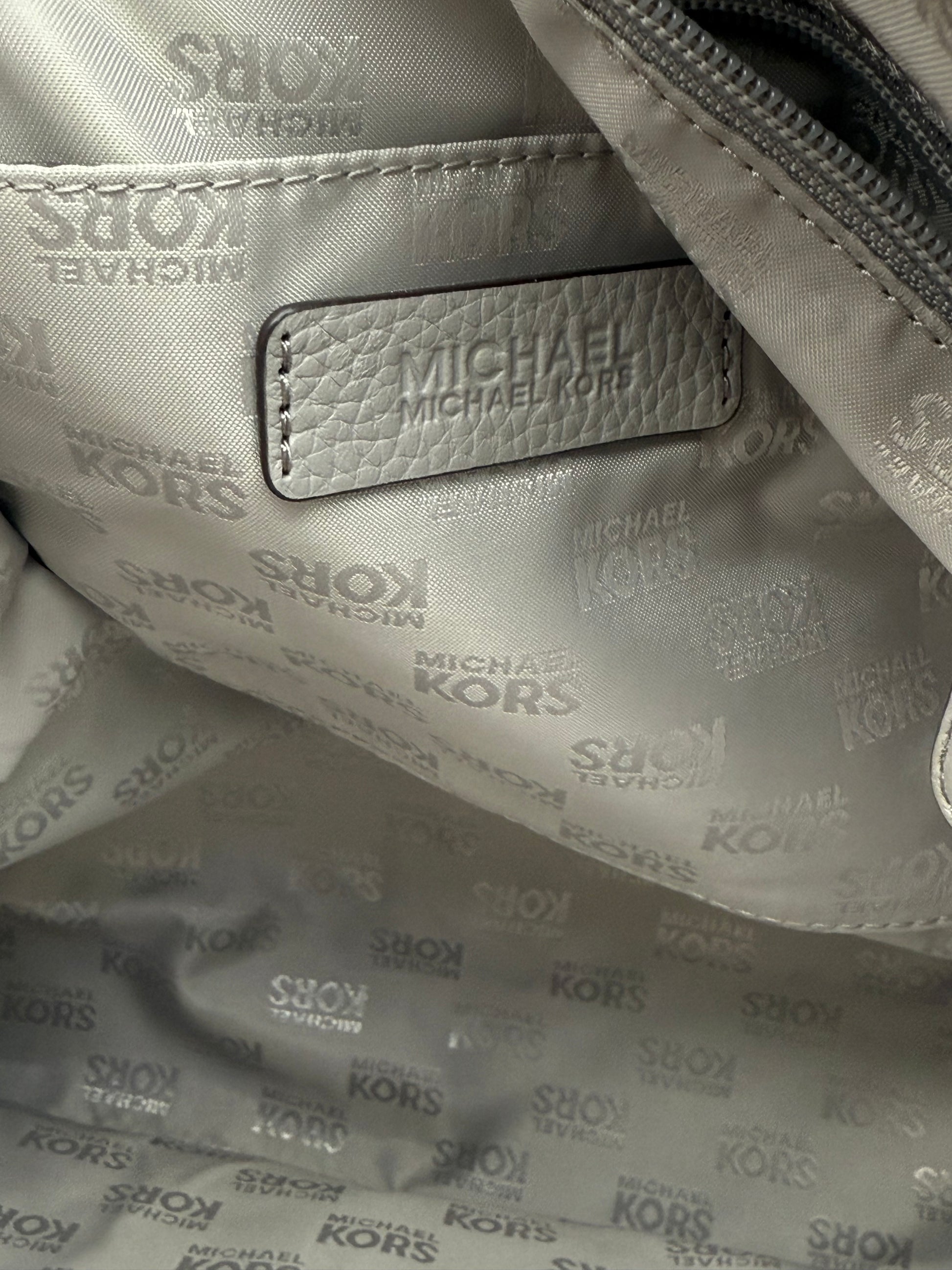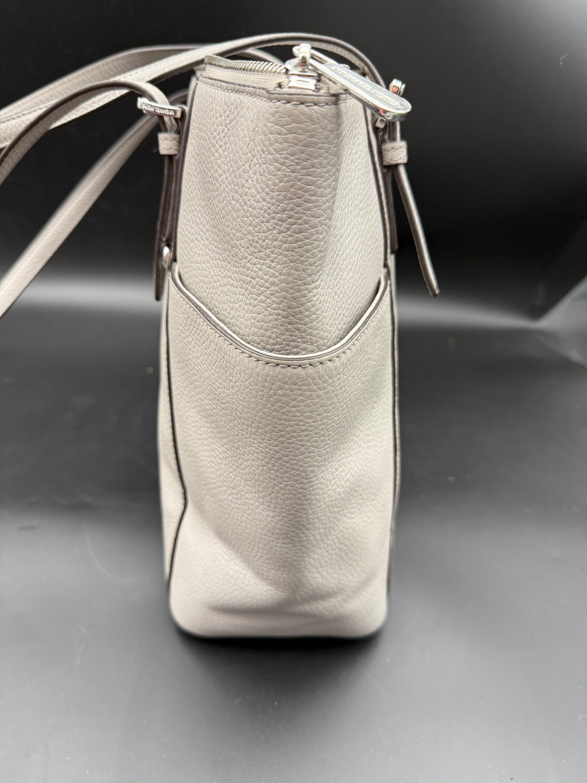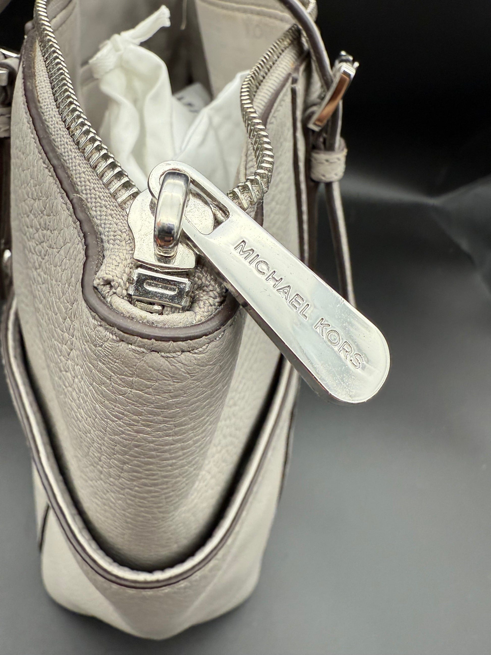 This is a Michael Kors handbag, identifiable by the signature "MK" logo charm. It's a structured tote style featuring double handles and a pebbled leather texture, making it both stylish and functional for daily use.