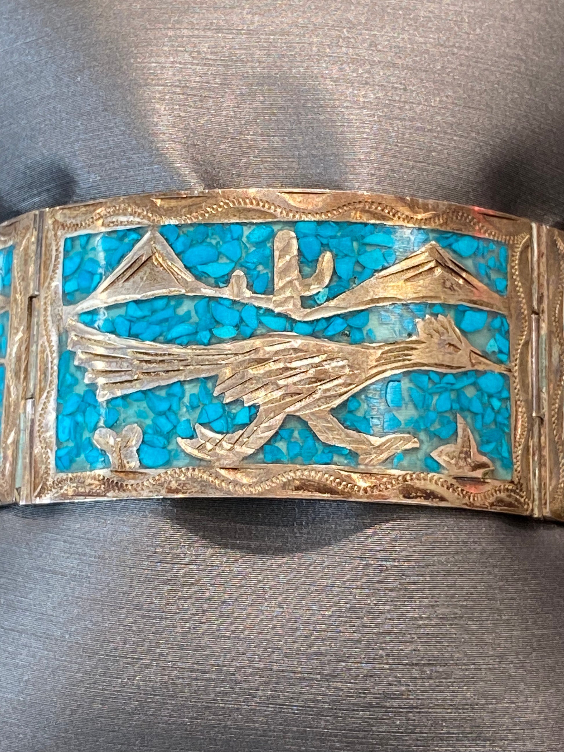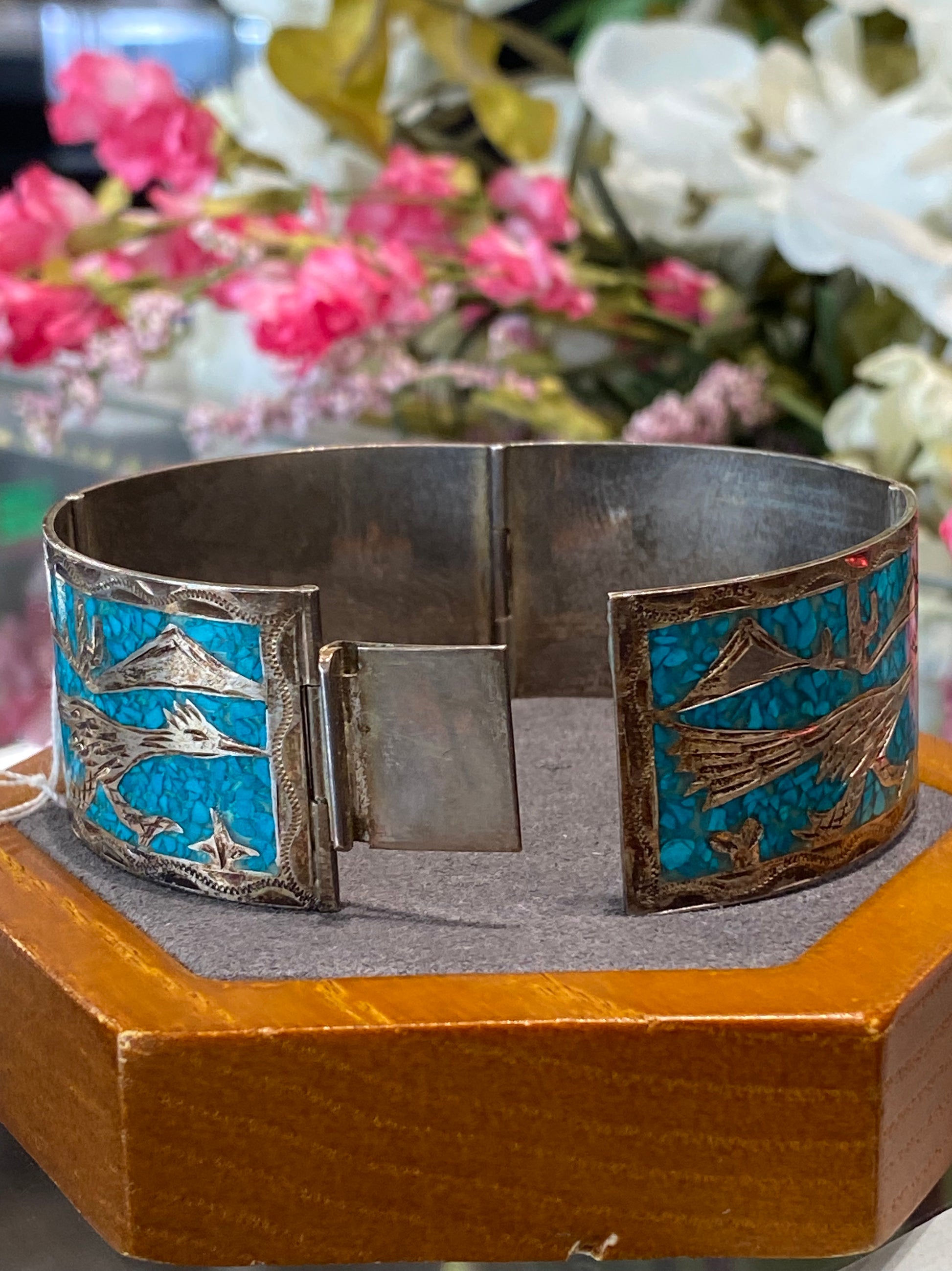 37.4 Grams Of 925 Silver Bracelet With A Colored Stone & Design. Bracelet Is 6.5” Long.