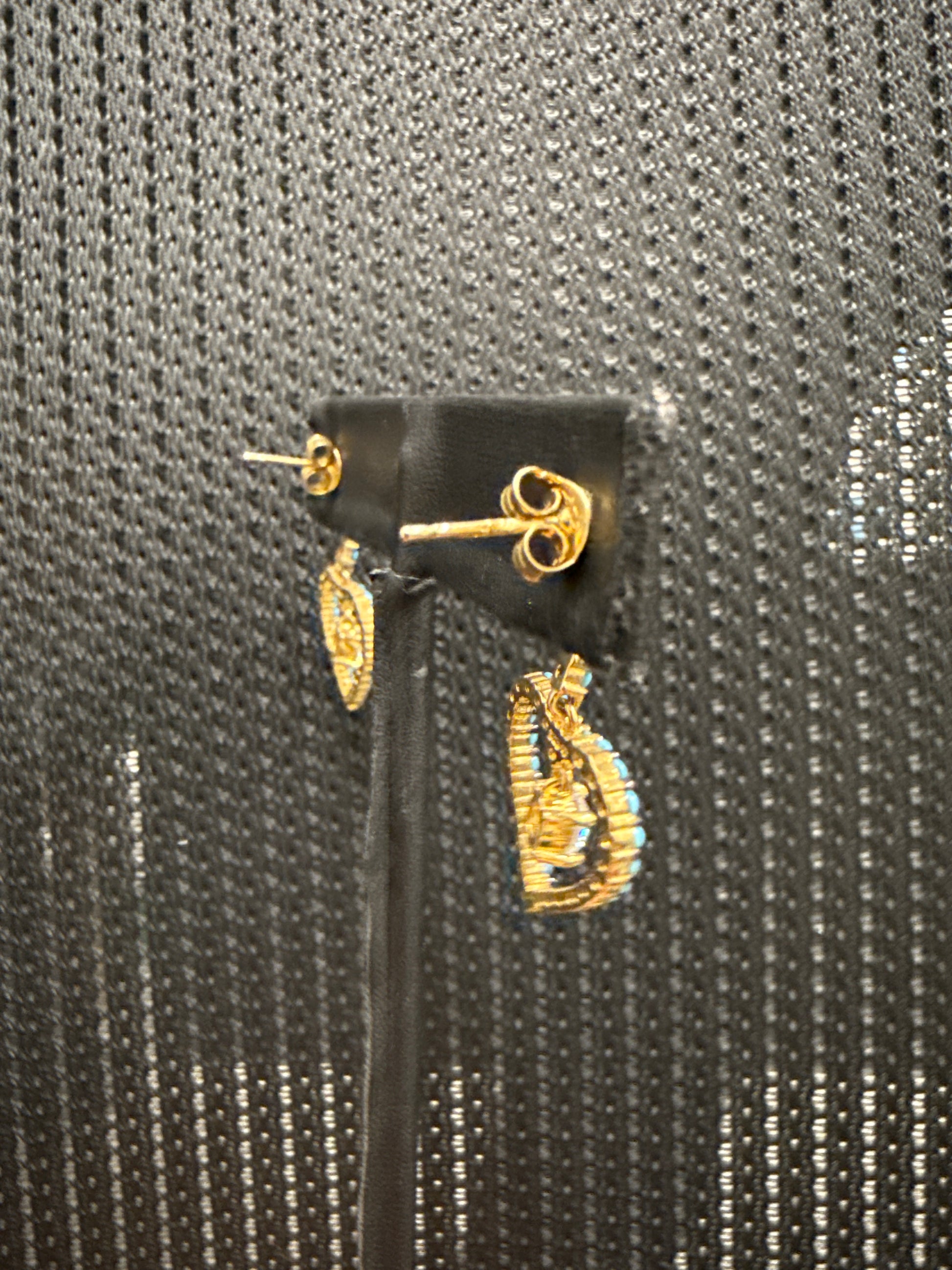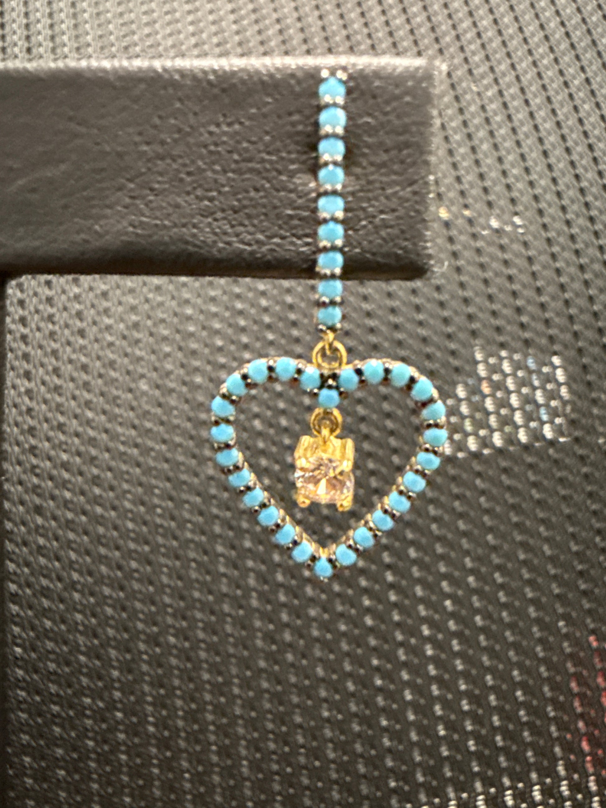 Silver 925 gold plated 3.5g dangle style heart earrings w/ blue stones and cubic zirconias