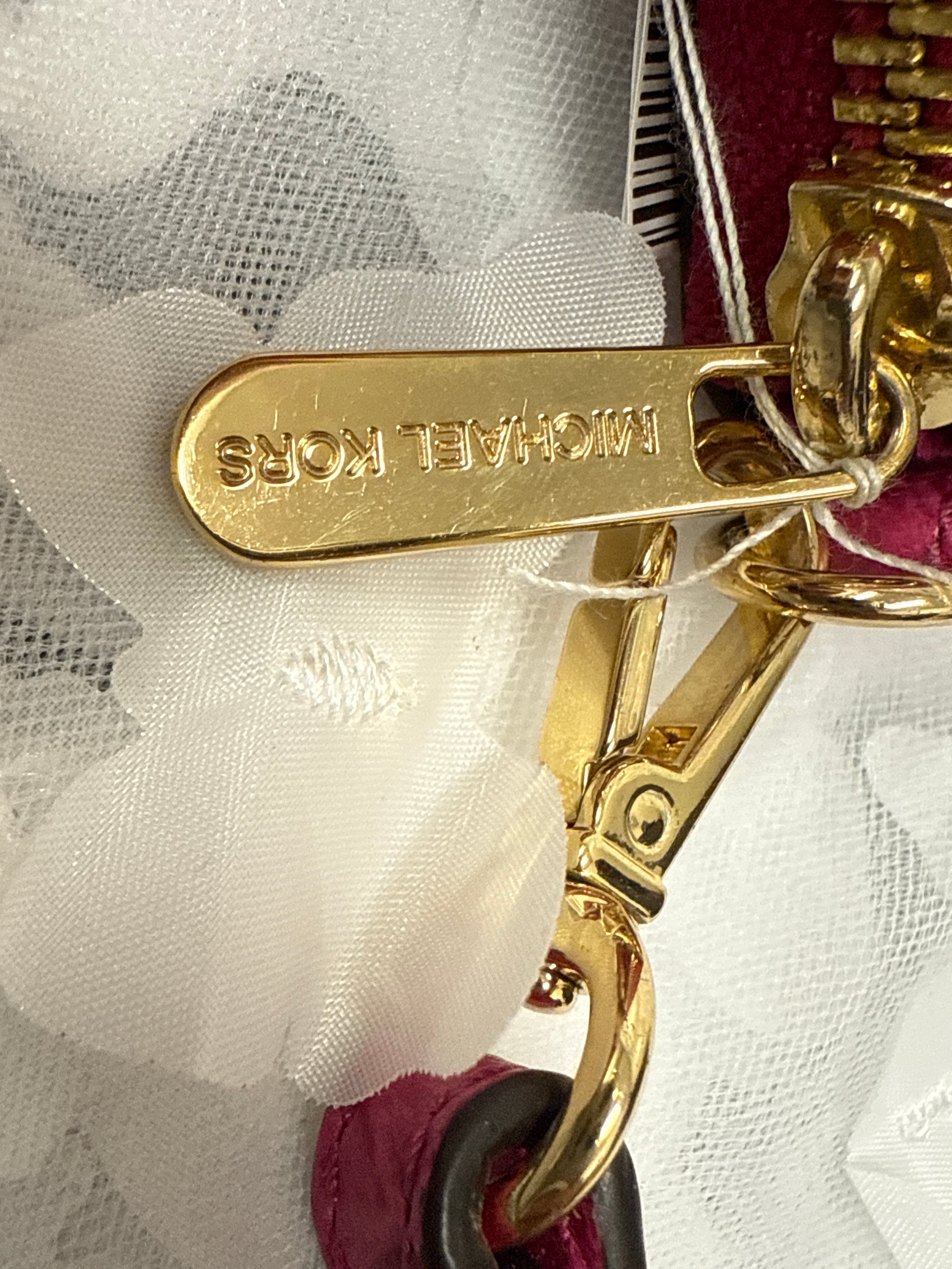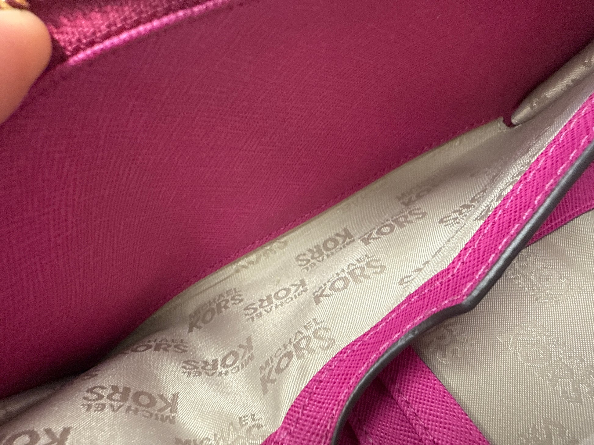 This is a Michael Kors wristlet wallet in a striking pink color with a textured, snake-skin pattern. The gold MK logo and the detachable wrist strap offers convenient carrying.