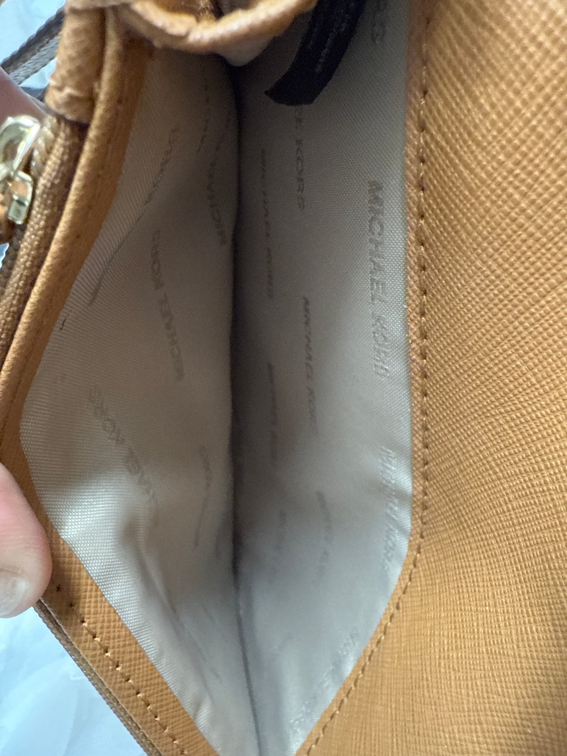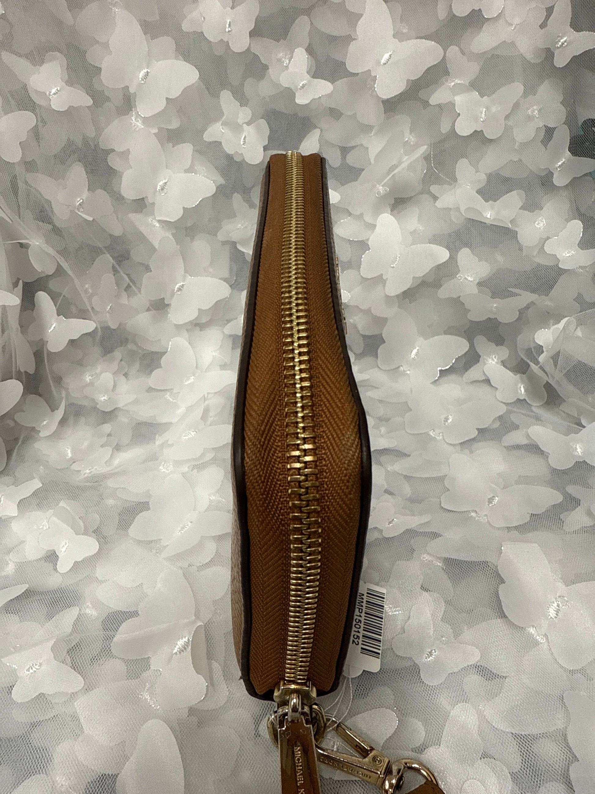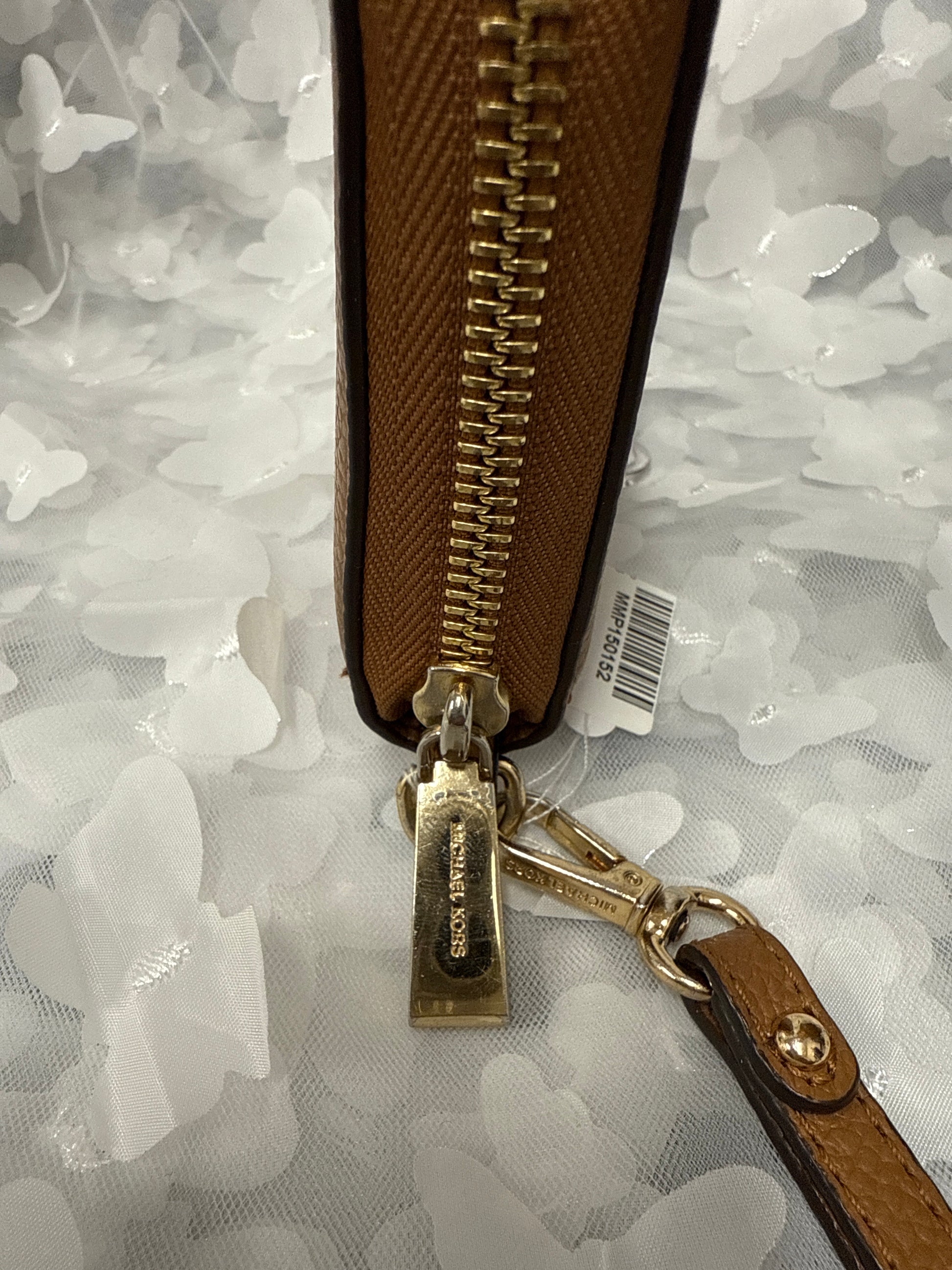 This is a Michael Kors wristlet wallet, designed in a rich tan brown pebbled leather with a detachable strap.