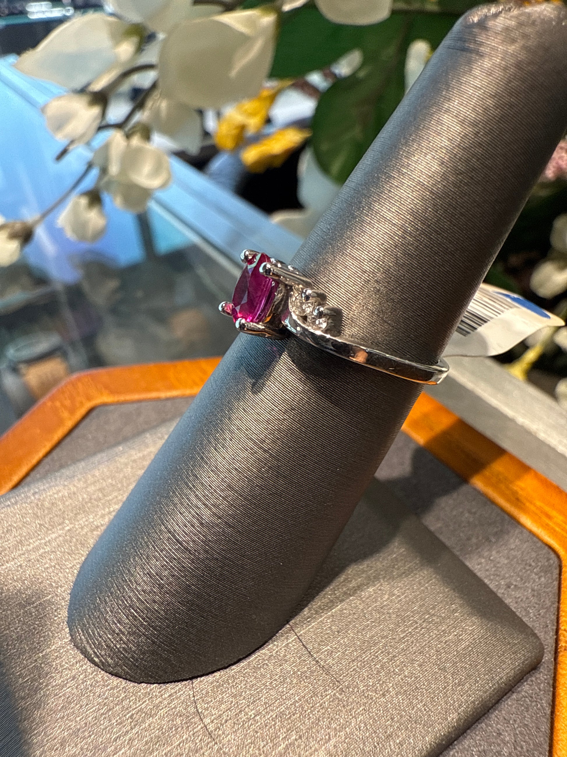 14k white gold ring with 4 diamonds and a red center stone 2.7g size 6